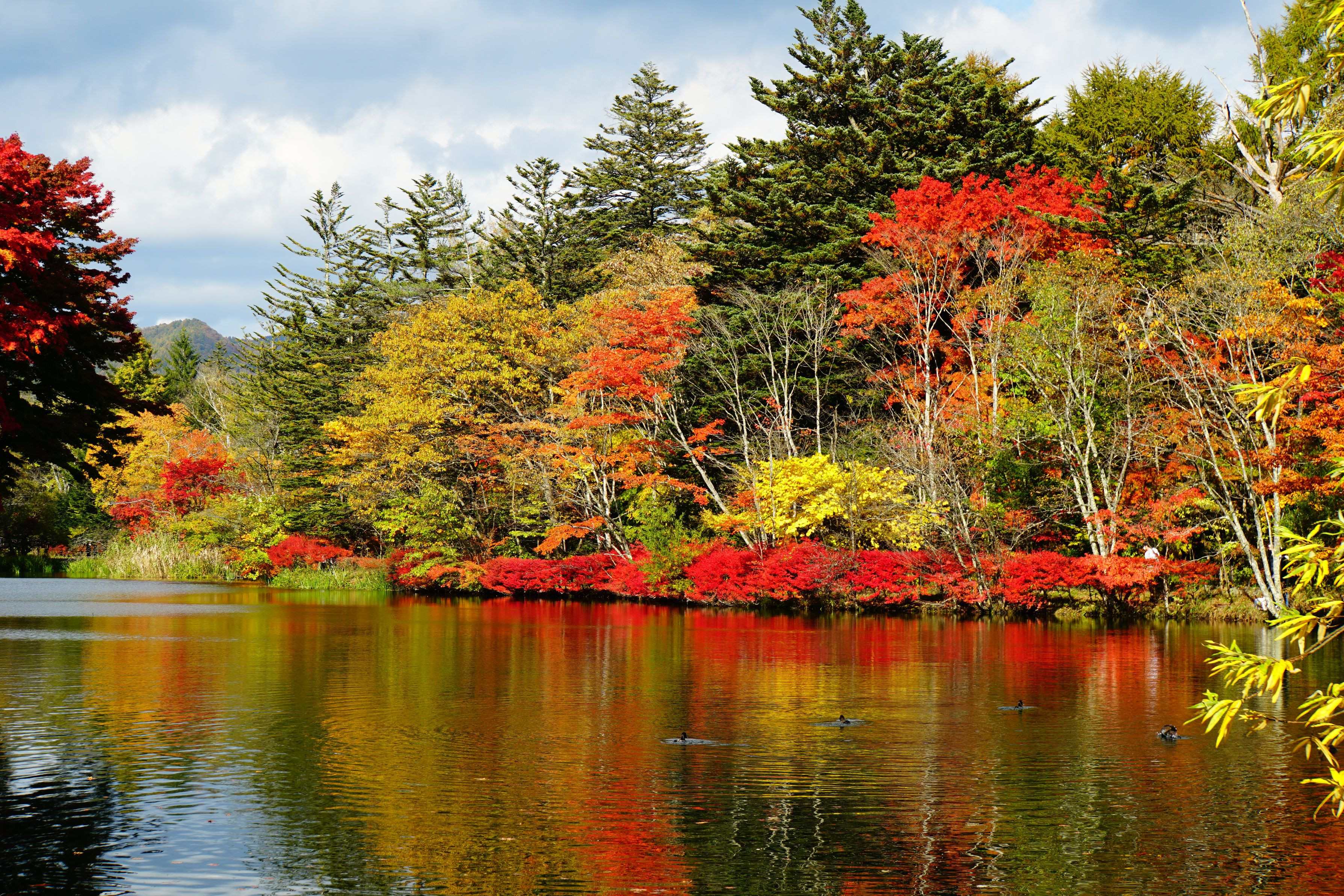 軽井沢の雲場池で。真っ赤なモミジが池に映え、秋の光景が広がっていました。