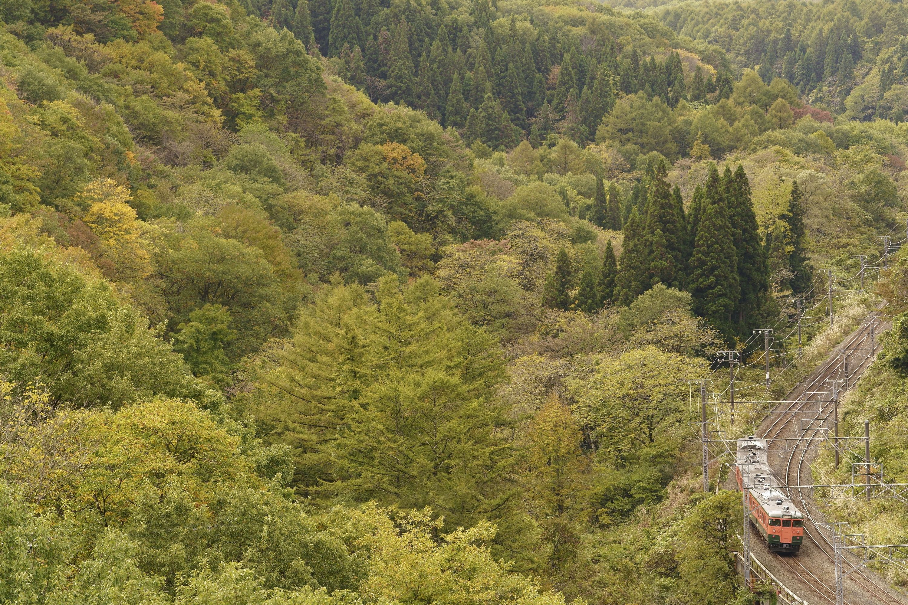 うっすらと色づき始めた谷あいを県境を超えて列車がやってきました。