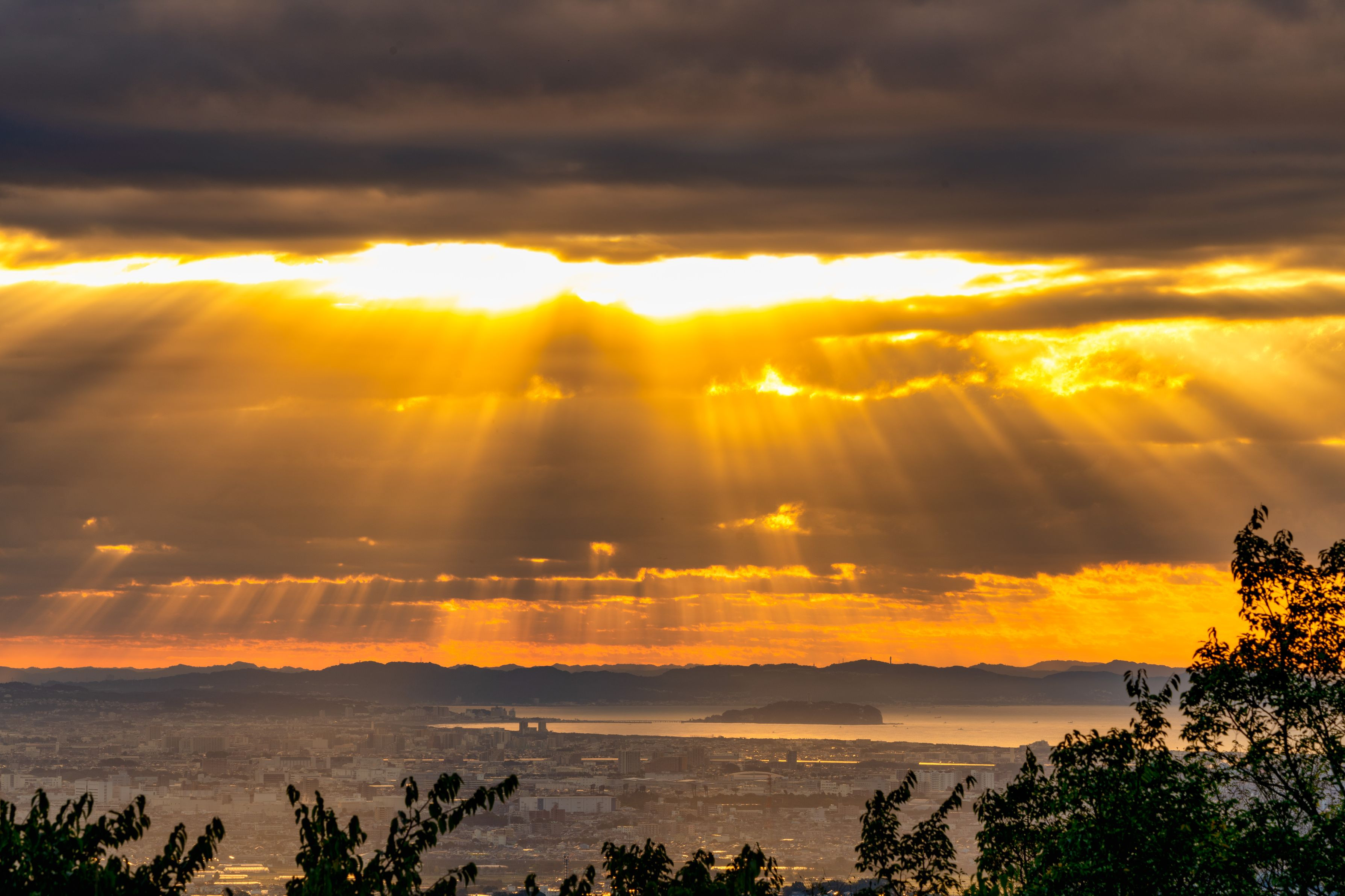 可能な限り毎週末、近くの山から日の出を撮っていますが、この日は雲の隙間から光が漏れて神々しい感じがしました。ちなみに、中央右下の島は江ノ島です。