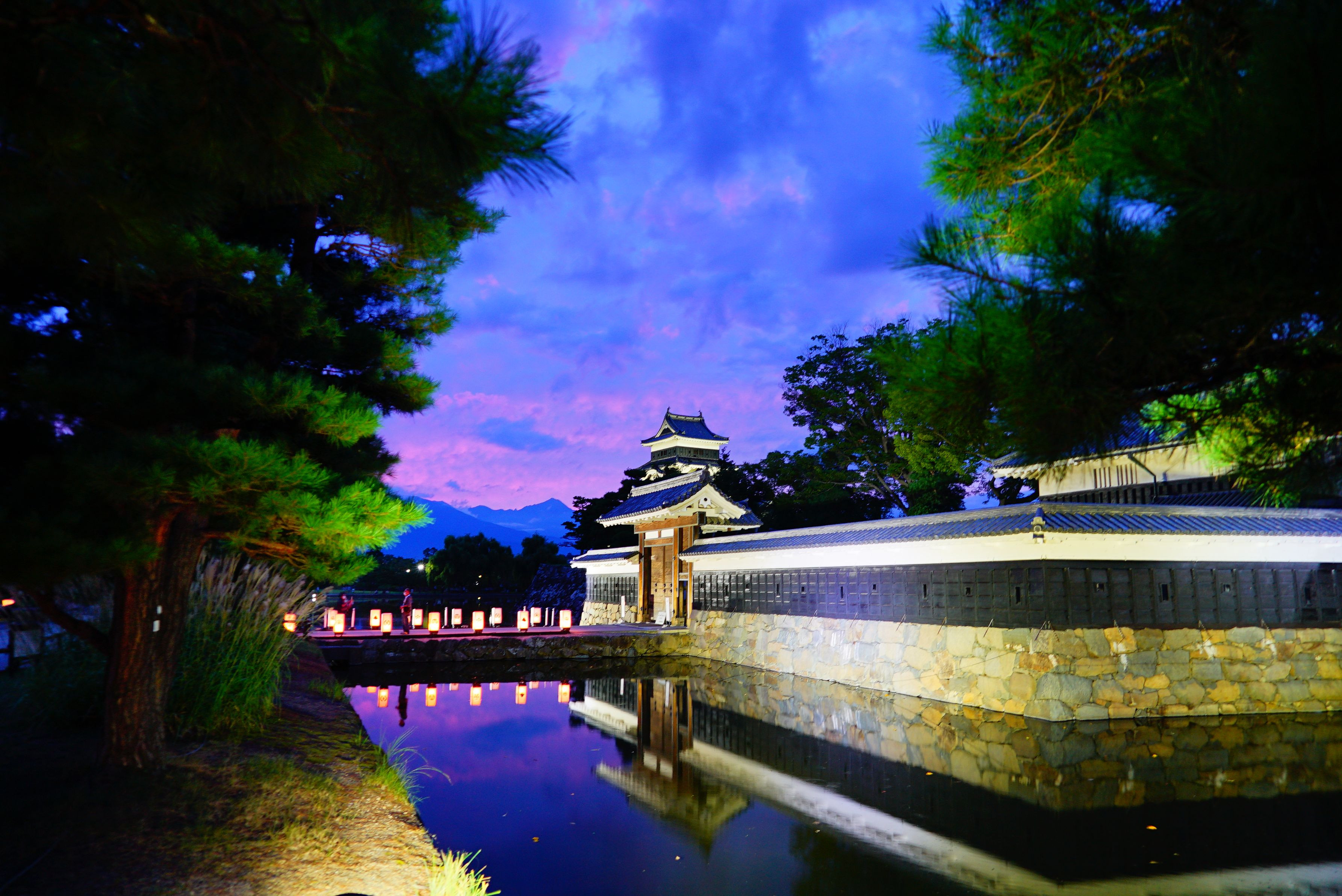 国宝 松本城へ登城しました。 遠く北アルプスのスカイラインのシルエットが見えました。 ライトアップされた松本城は美しいですね。