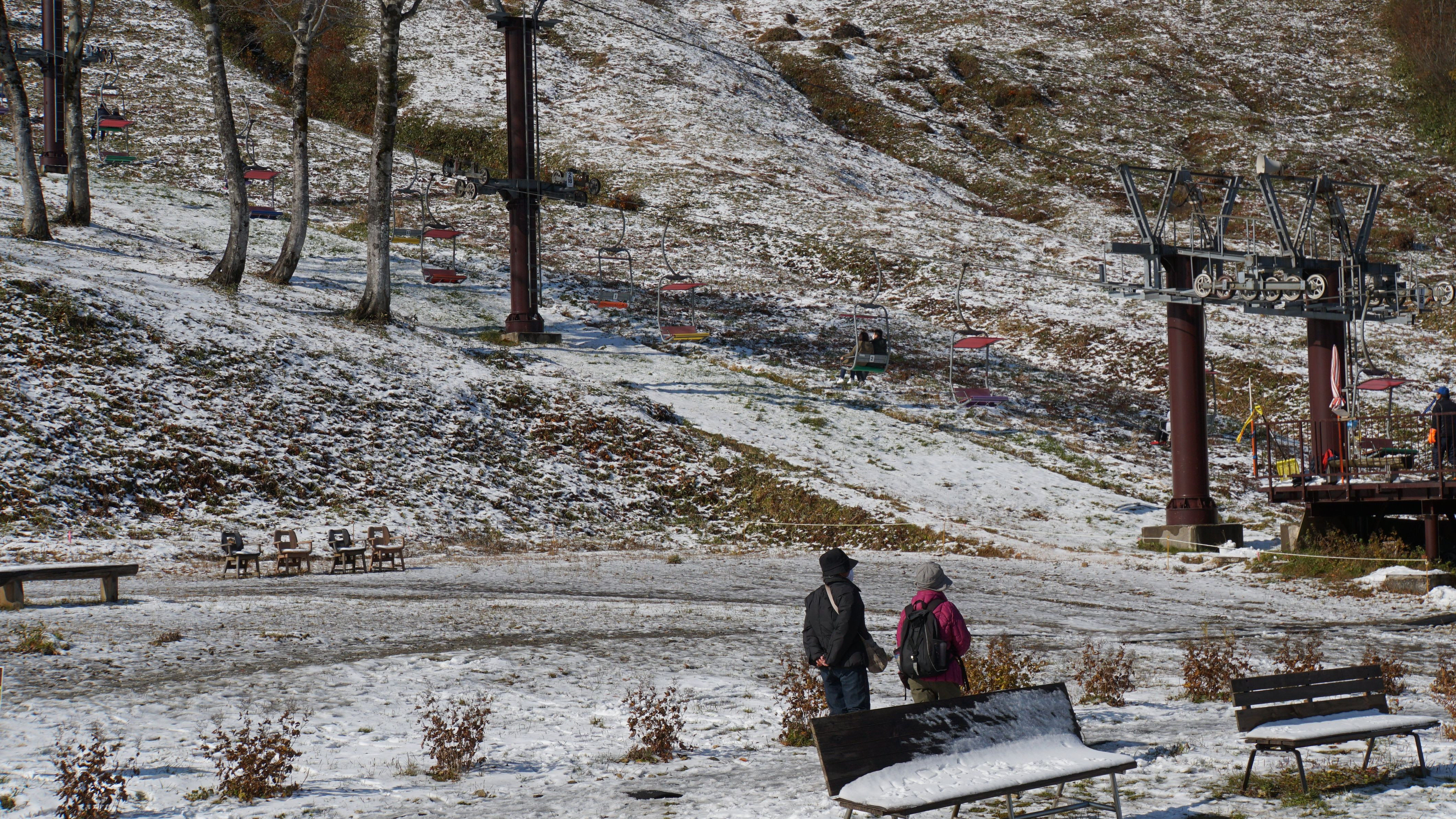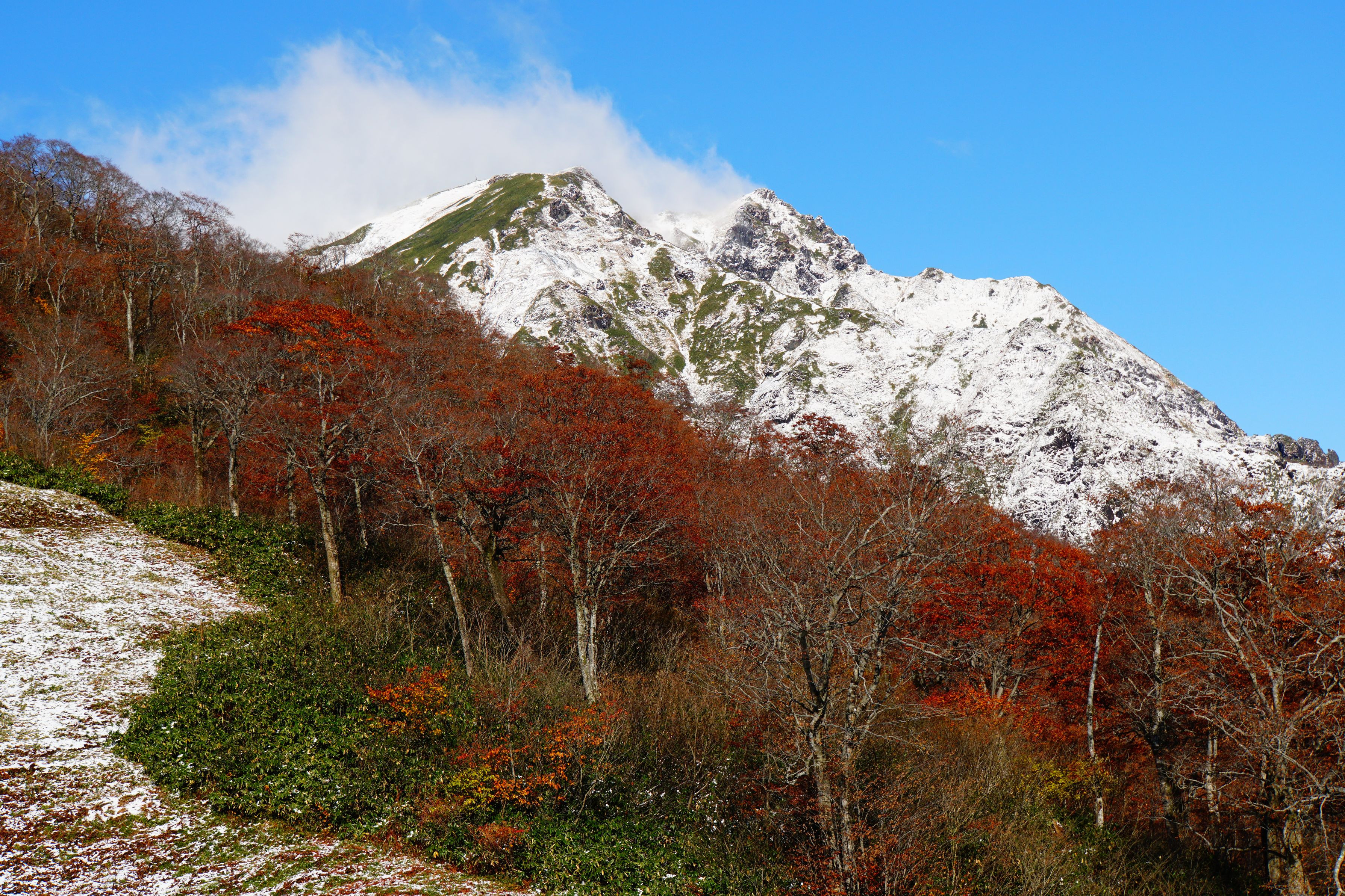 谷川岳ロープウェイの天神平で。 当日降った雪が所々に残り、紅葉とコラボしていました。