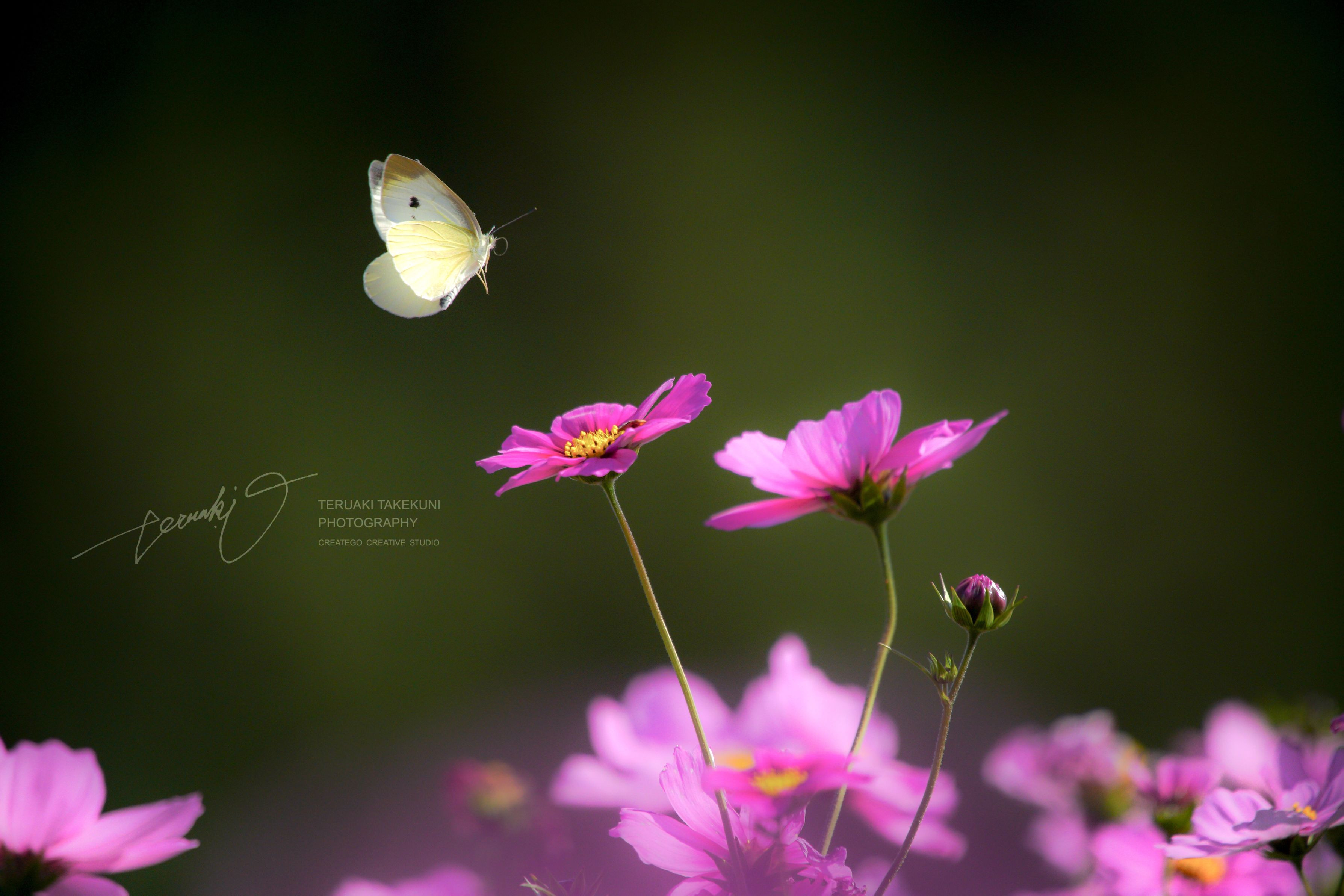 風に逆らわずユラユラと揺れるコスモスにモンシロチョウが踊る。彼らの世界ではきっとスローモーションのように滑らかに踊るように。