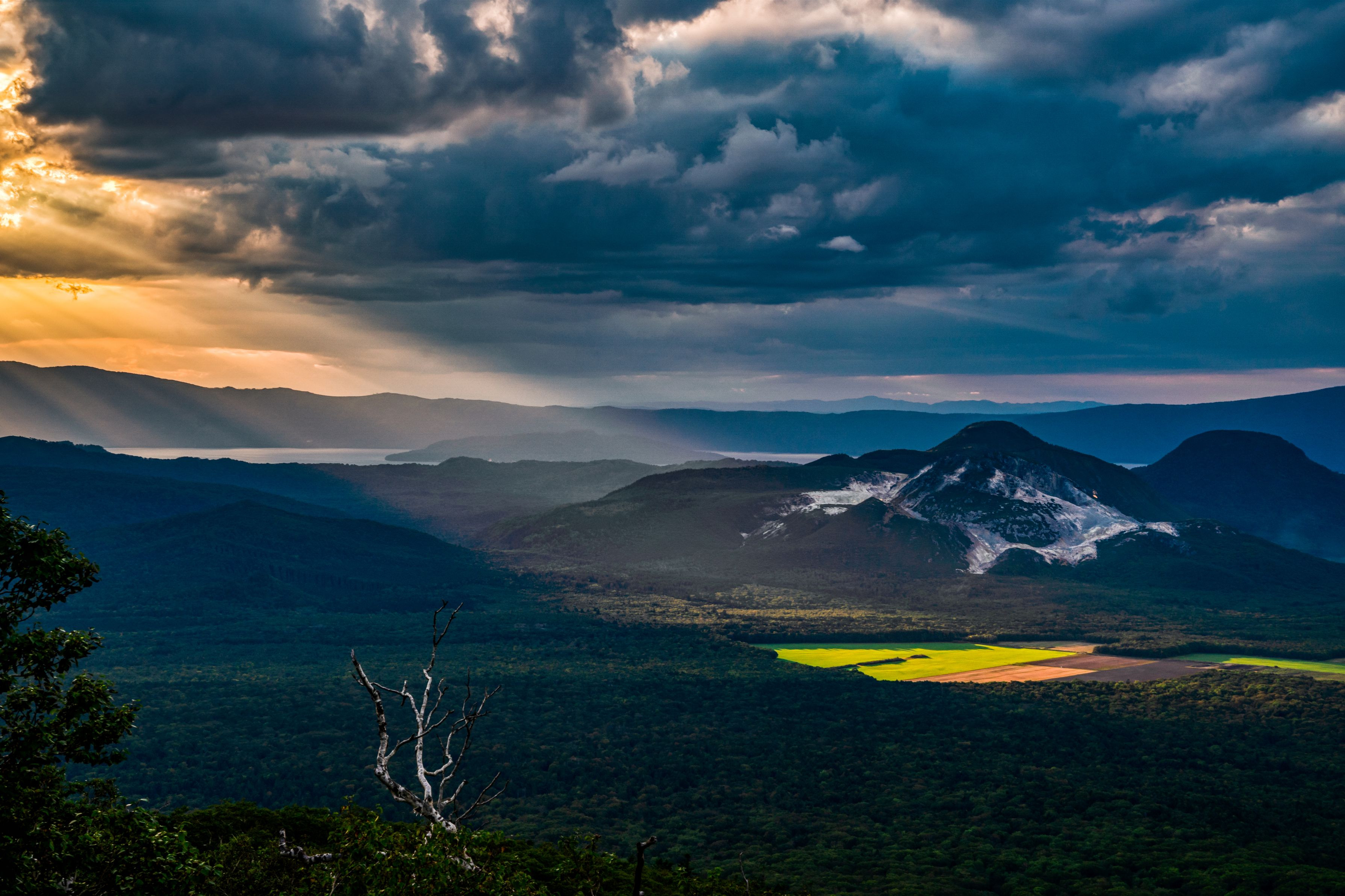 厚い雲の隙間からこぼれた光が牧場の緑を 浮き上がらせた瞬間です