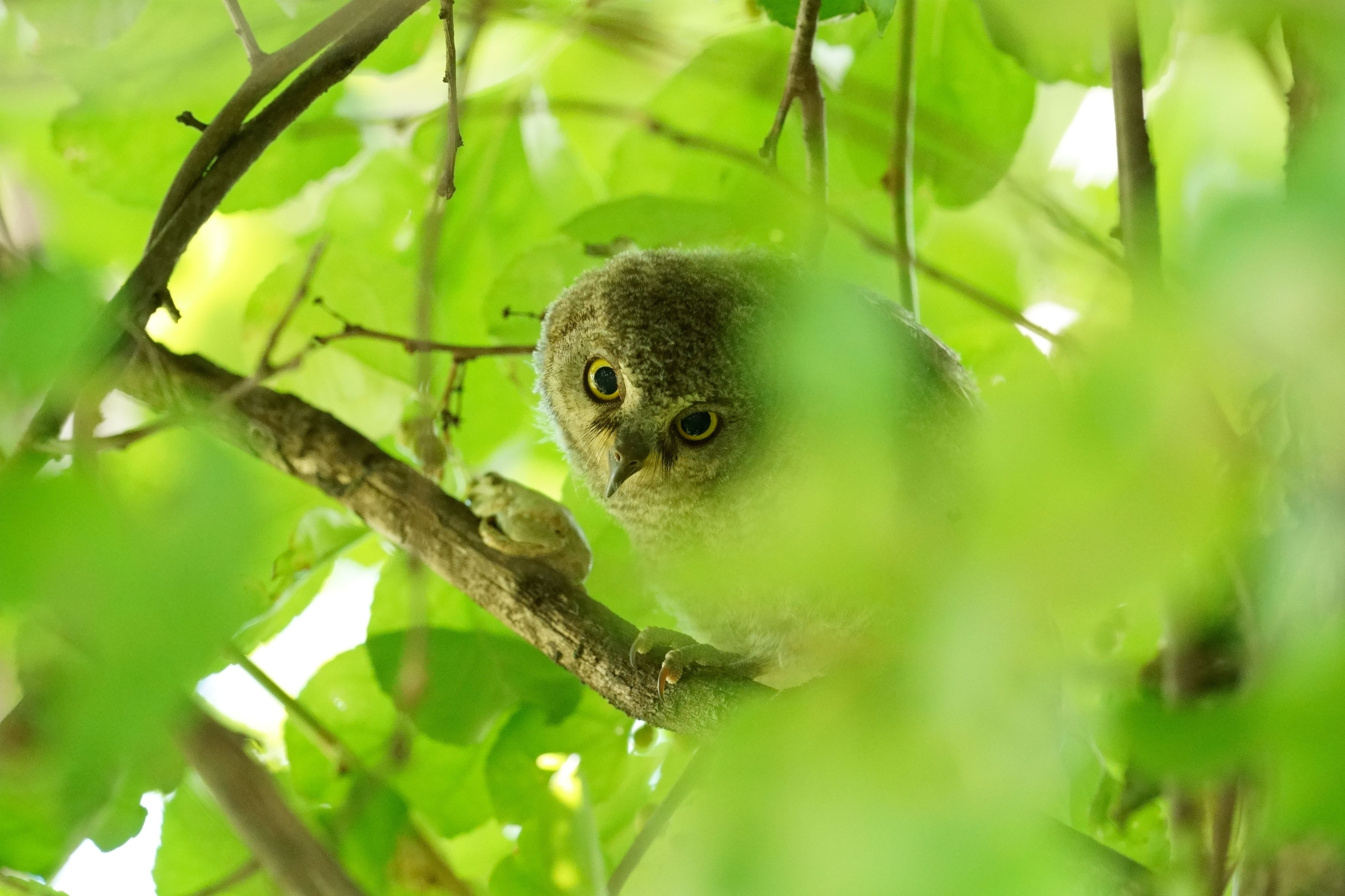 コノハズクのヒナがアマガエルと同じ枝に・・・。 しかし、興味があるのは、カメラを向ける私の方だったらしい・・・。