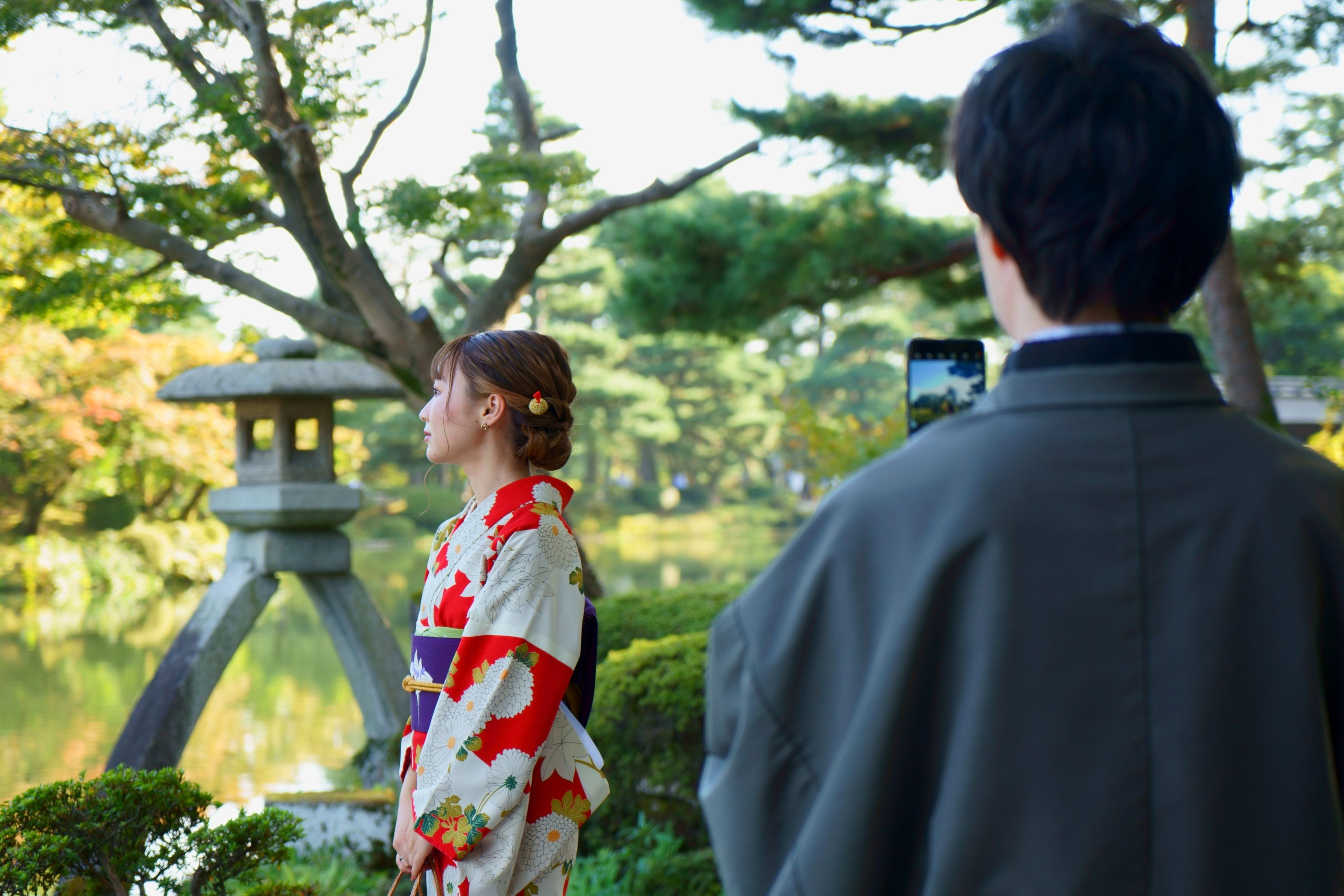 兼六園の琴柱灯籠の前で着物美人さん発見! 写真を撮る時以外はマスクをして、フォトスポットでは外して撮影。マスクをすればお化粧が崩れてしまうのに、マナーを守っていただきありがたいことです。これぞ、新生活様式ですね。この後掲載許可いただきました。ありがとうございます。 。。。頭から木が生えてるようになってしまって失敗(T_T)