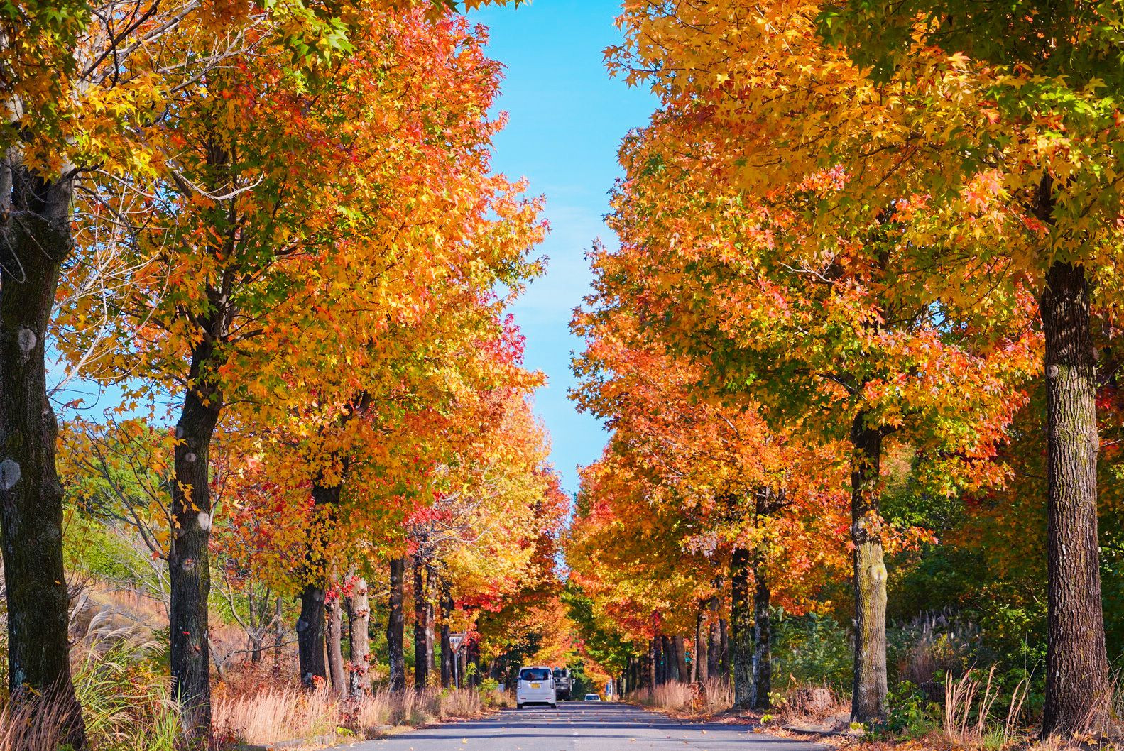 人も車も少ない並木道、道路の真ん中から撮影。