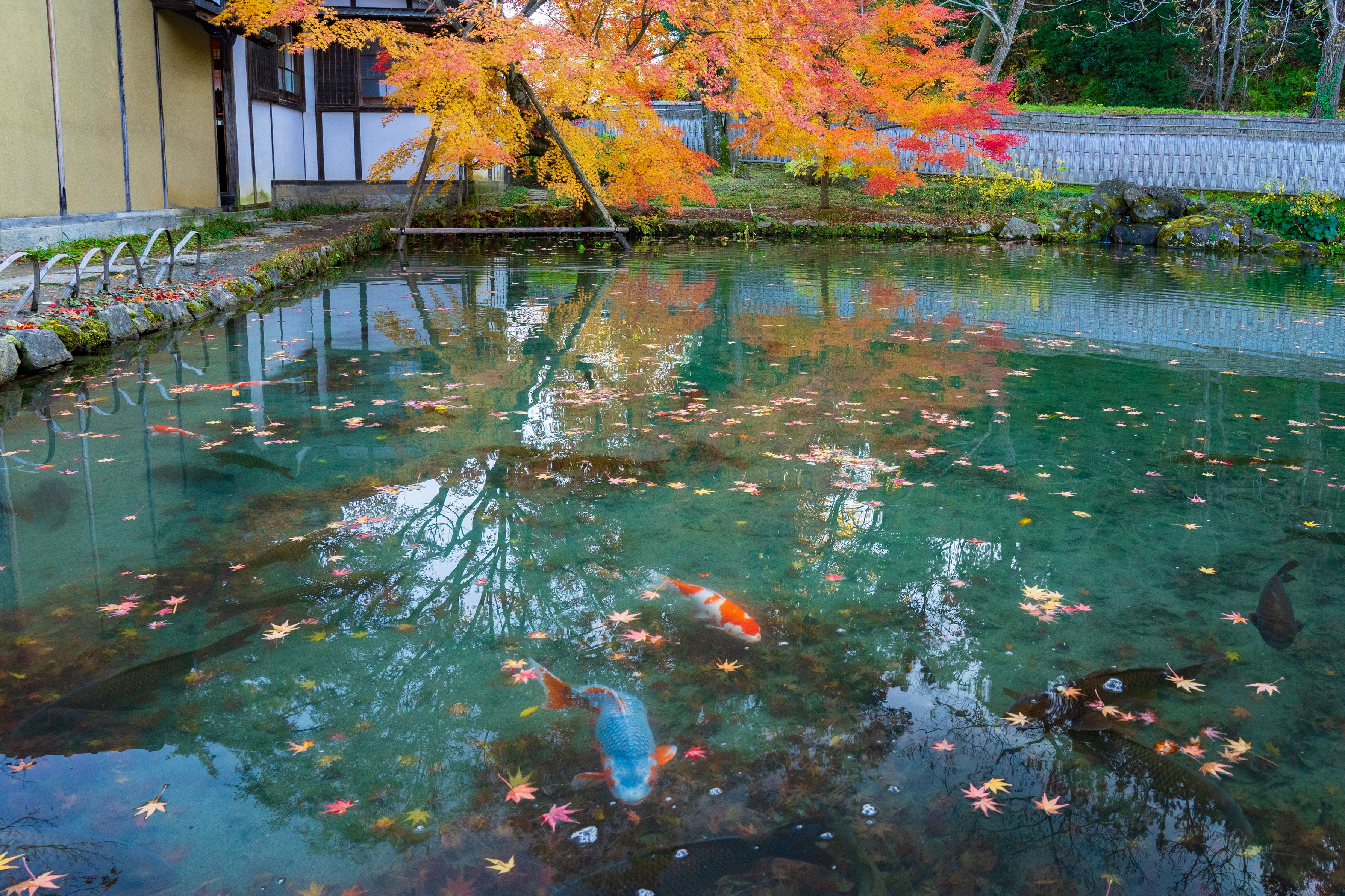 滝と倒木と黄葉