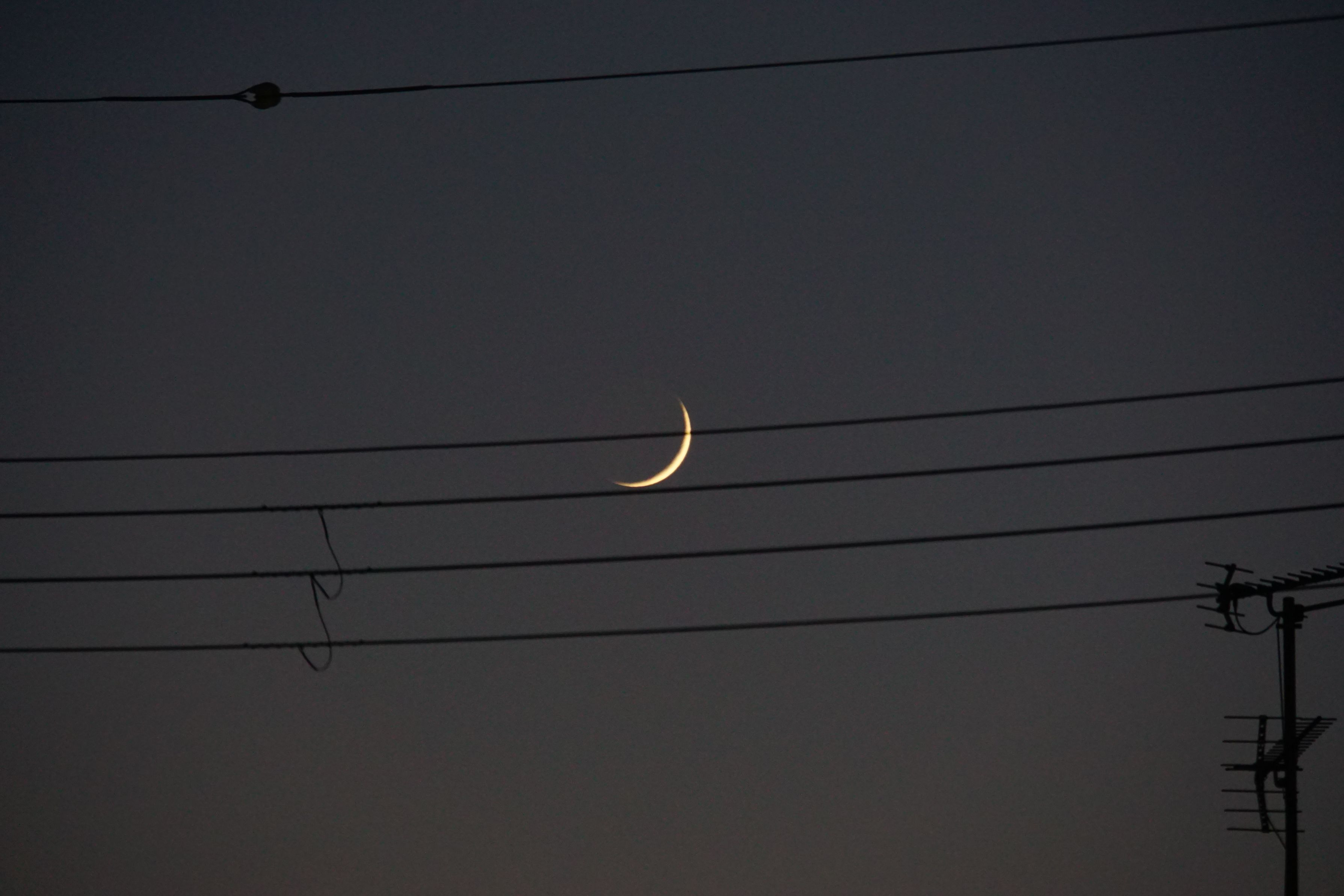 三日月の前の「繊月」が、電線の五線譜(になってないけど)にかかって、なにか音楽を奏でていました。 「ちゃりらりーんって。」聞こえてこない?