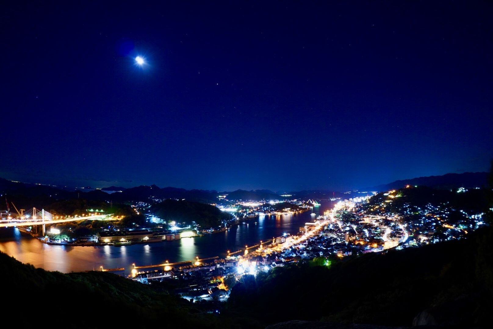 浄土寺山不動岩からの眺望 魚眼を使って尾道大橋から街の灯りと月に照らされた尾道水道を撮影してみました。