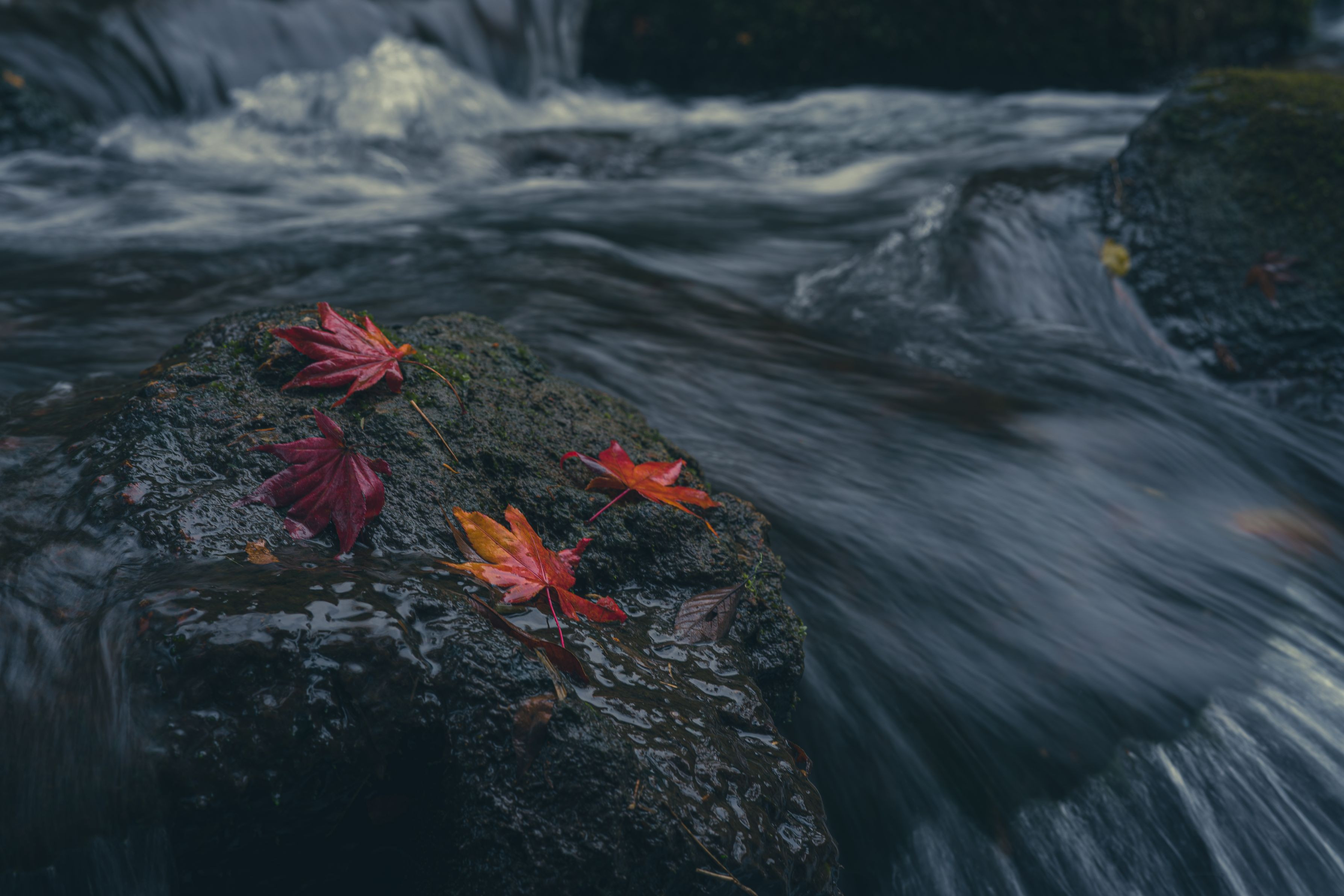 2018年,京都にある上賀茂神社で撮影しました。境内を流れる川に美しい紅葉が落ちていました。