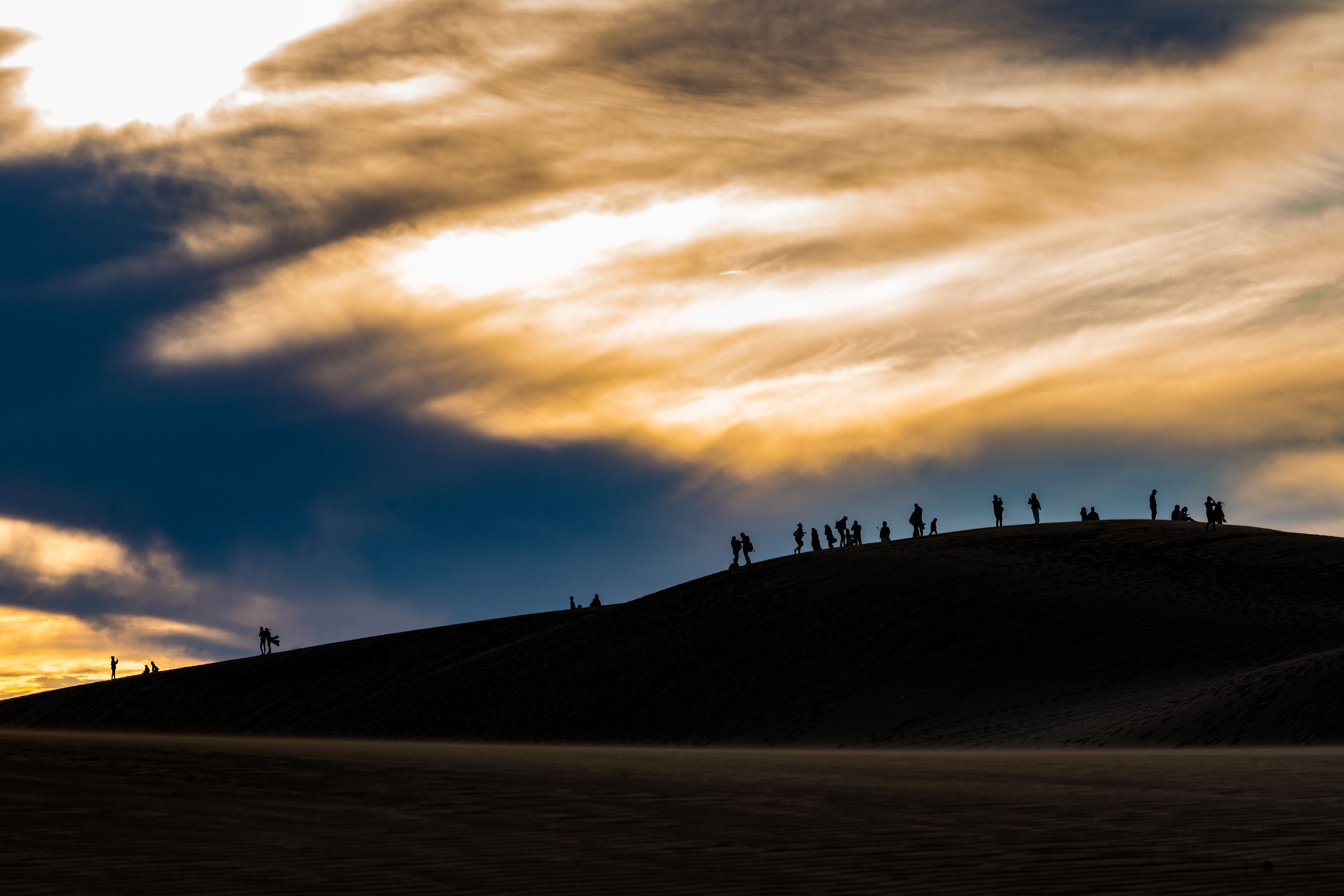夕景の鳥取砂丘、観光客のシルエットをズームして撮影