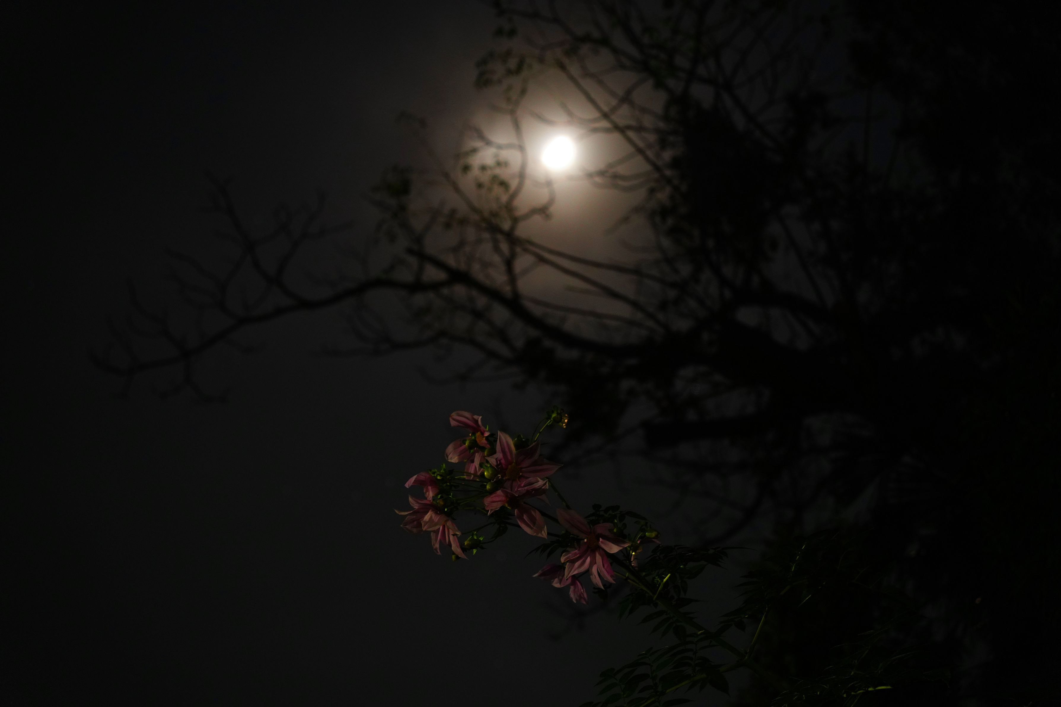 月明かりに儚く照らされている皇帝ダリアがとても綺麗で