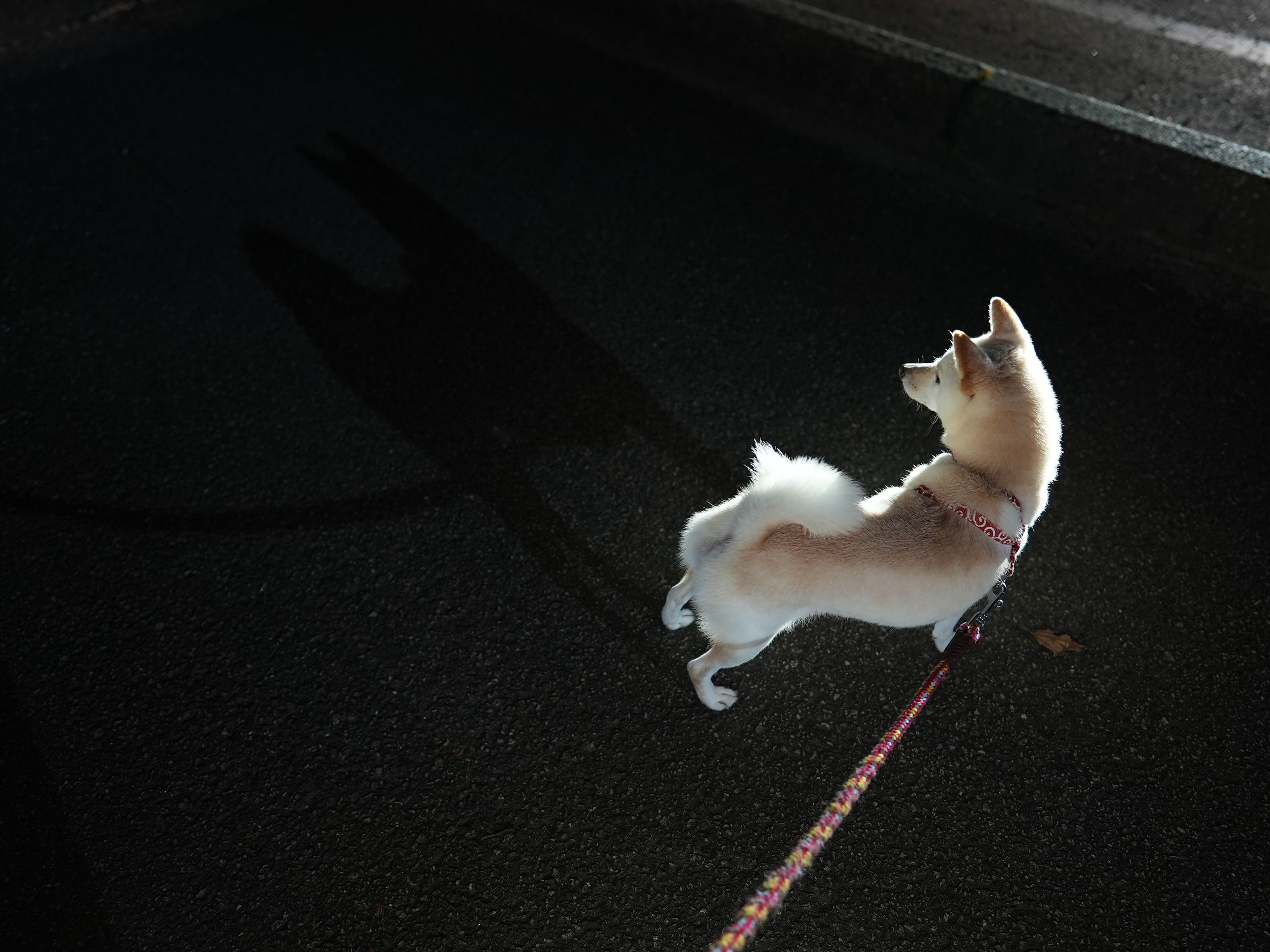 夜の散歩中、近くを通りかかった車のライトによってできた影に、少し驚きながらも向き合っていました。