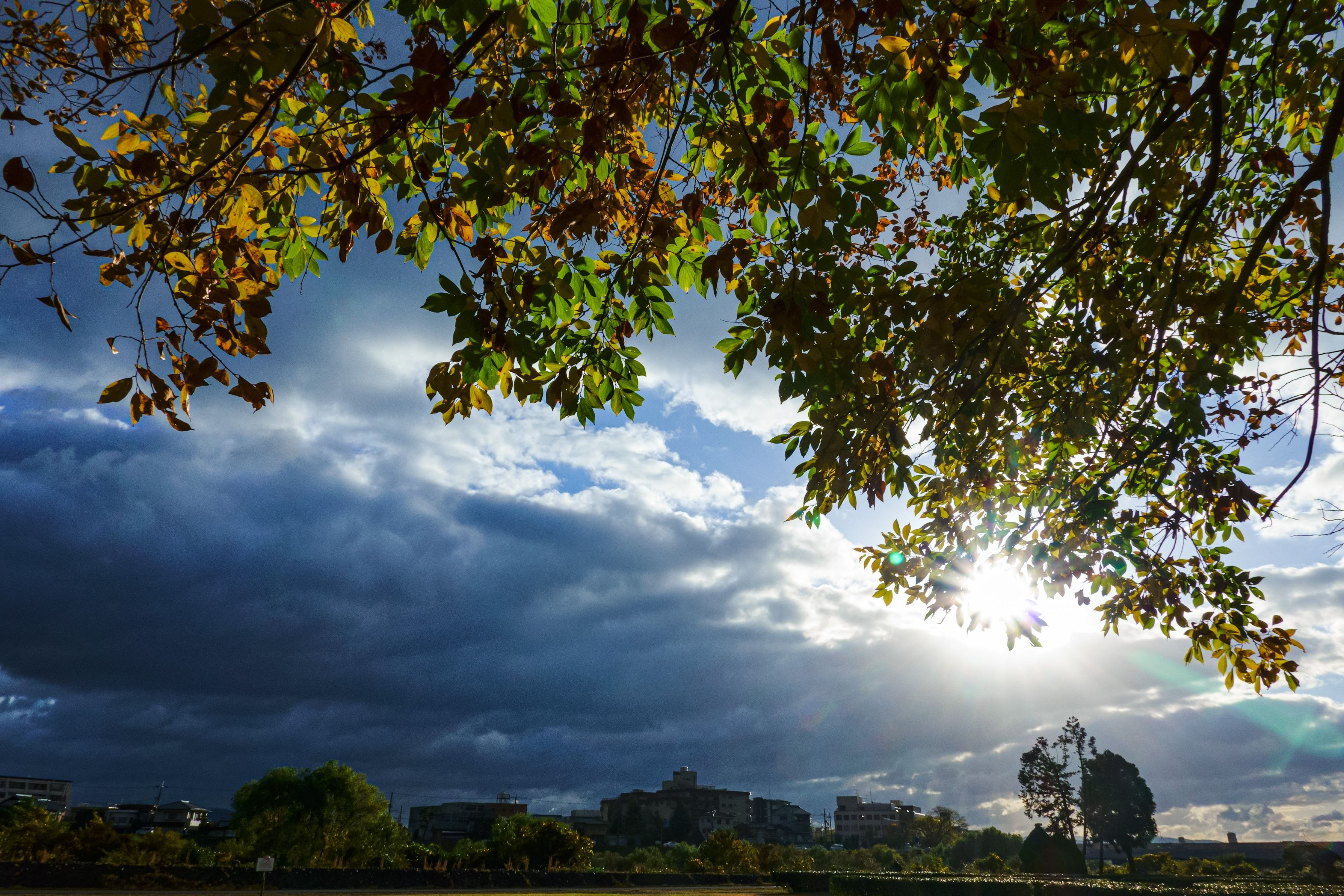 11月中旬、京都・松尾公園の朝日光芒が太陽のつばさに見えた瞬間です