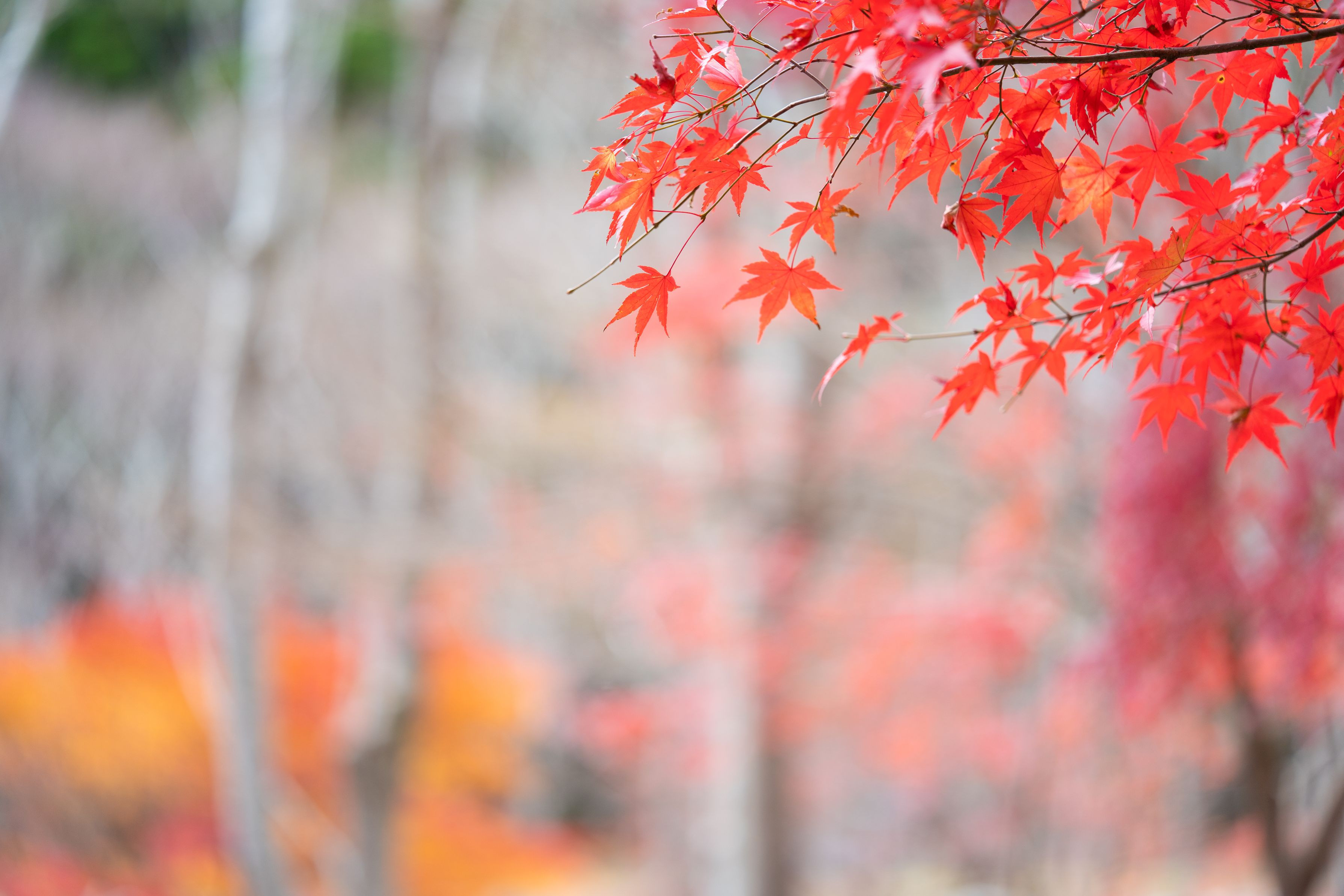 落葉樹の白っぽい幹、黄・オレンジ・赤・えんじに色づいた紅葉、さらに常緑樹の緑。自然が作り出す色の多彩さにうっとりです。