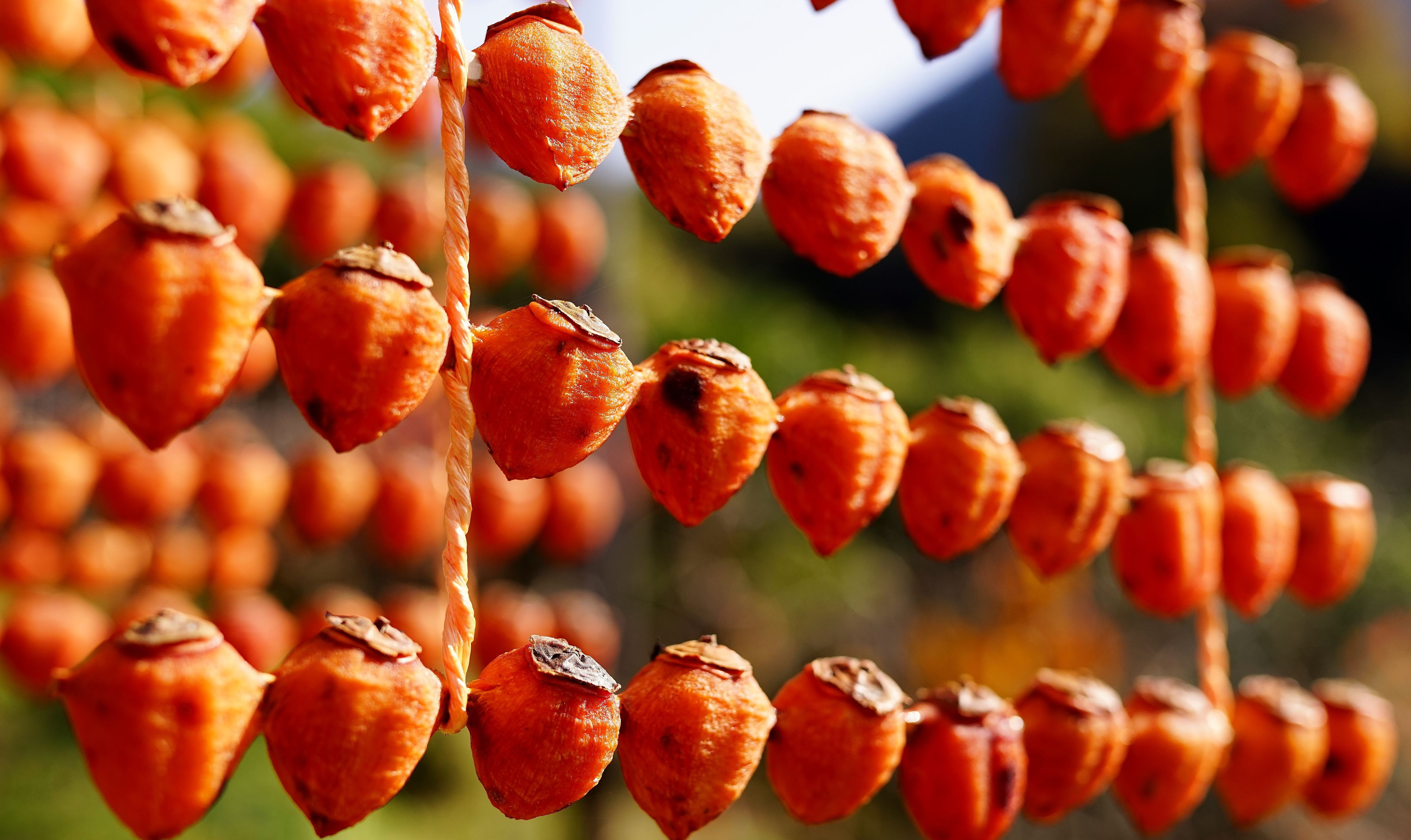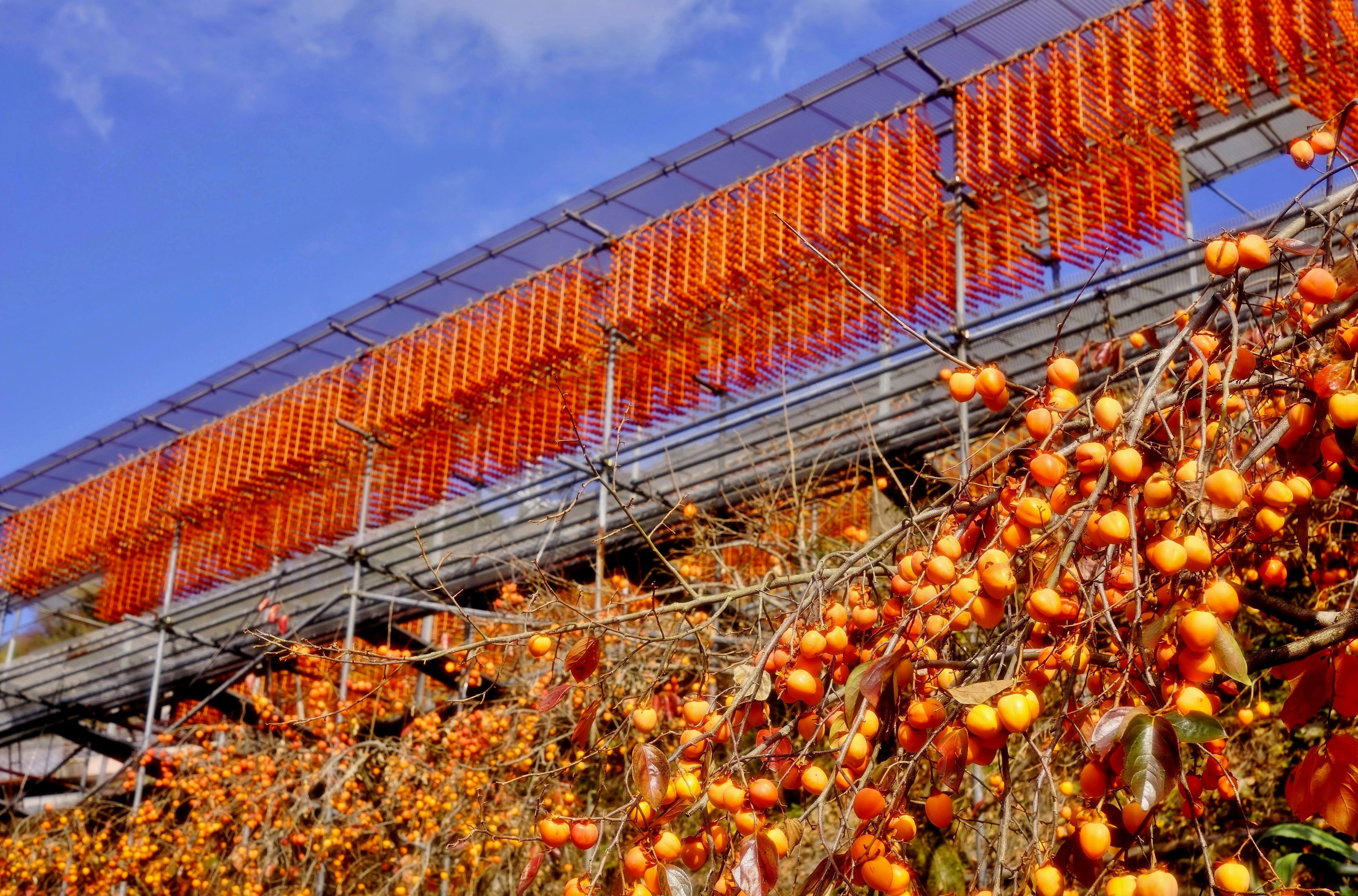 晩秋の風物詩、かつらぎ町四郷の串柿です。 正月のお飾り用なので製品はプレスして硬くします。 歯の頑丈な人なら食べられますが。