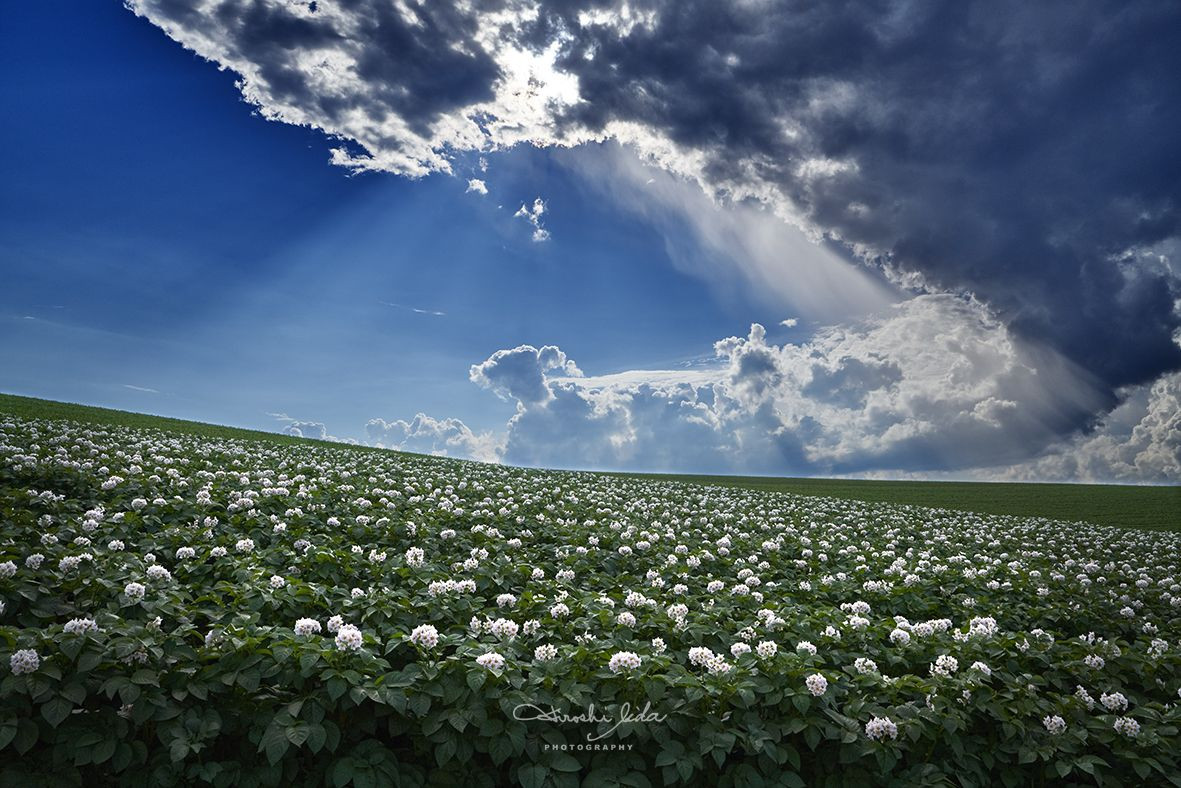 雨上がり直後に、黒雲の狭間から突然夏の太陽がジャガイモ畑の花々を照らし出しました