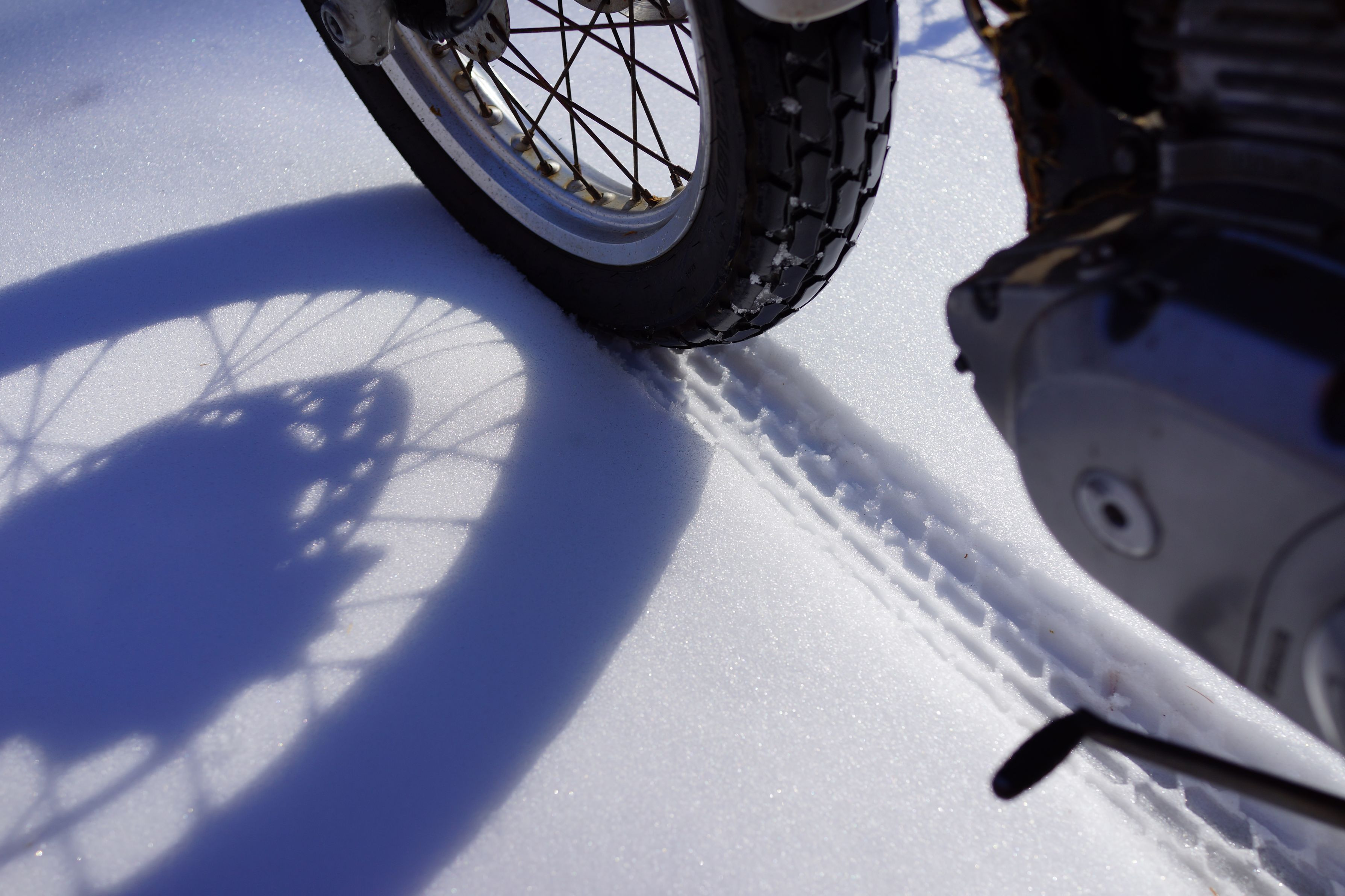 私の他に二輪車はおらず。前夜に降った雪を踏みしめて