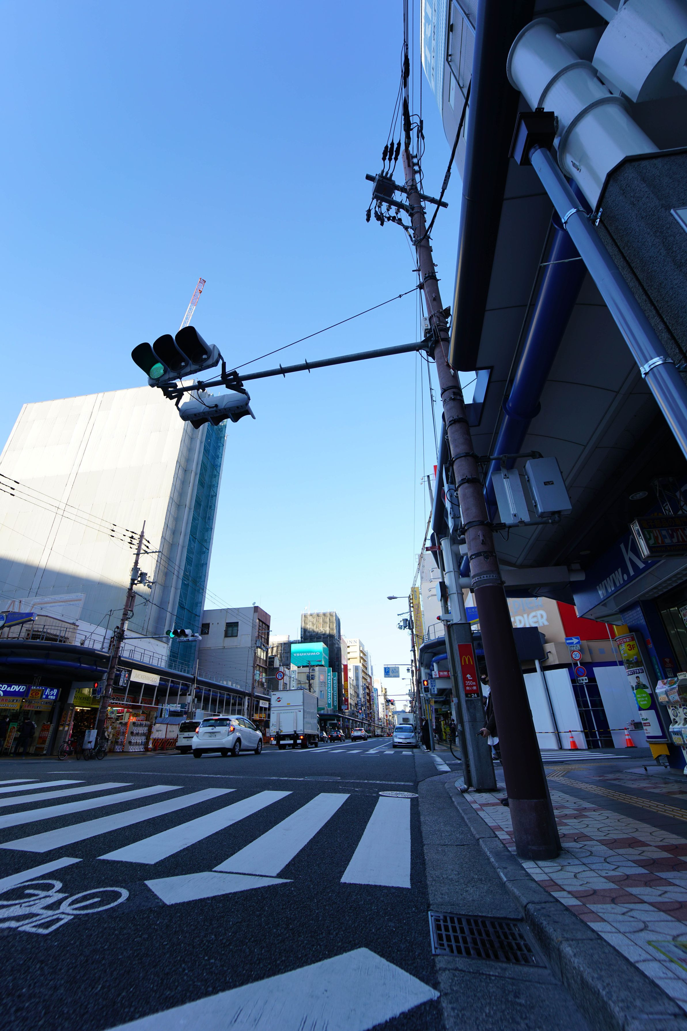 大阪の日本橋続続。 手前に対象物(信号機)があると超広角レンズは良いですね。大きく見えて、角度が出来て立体的になります^