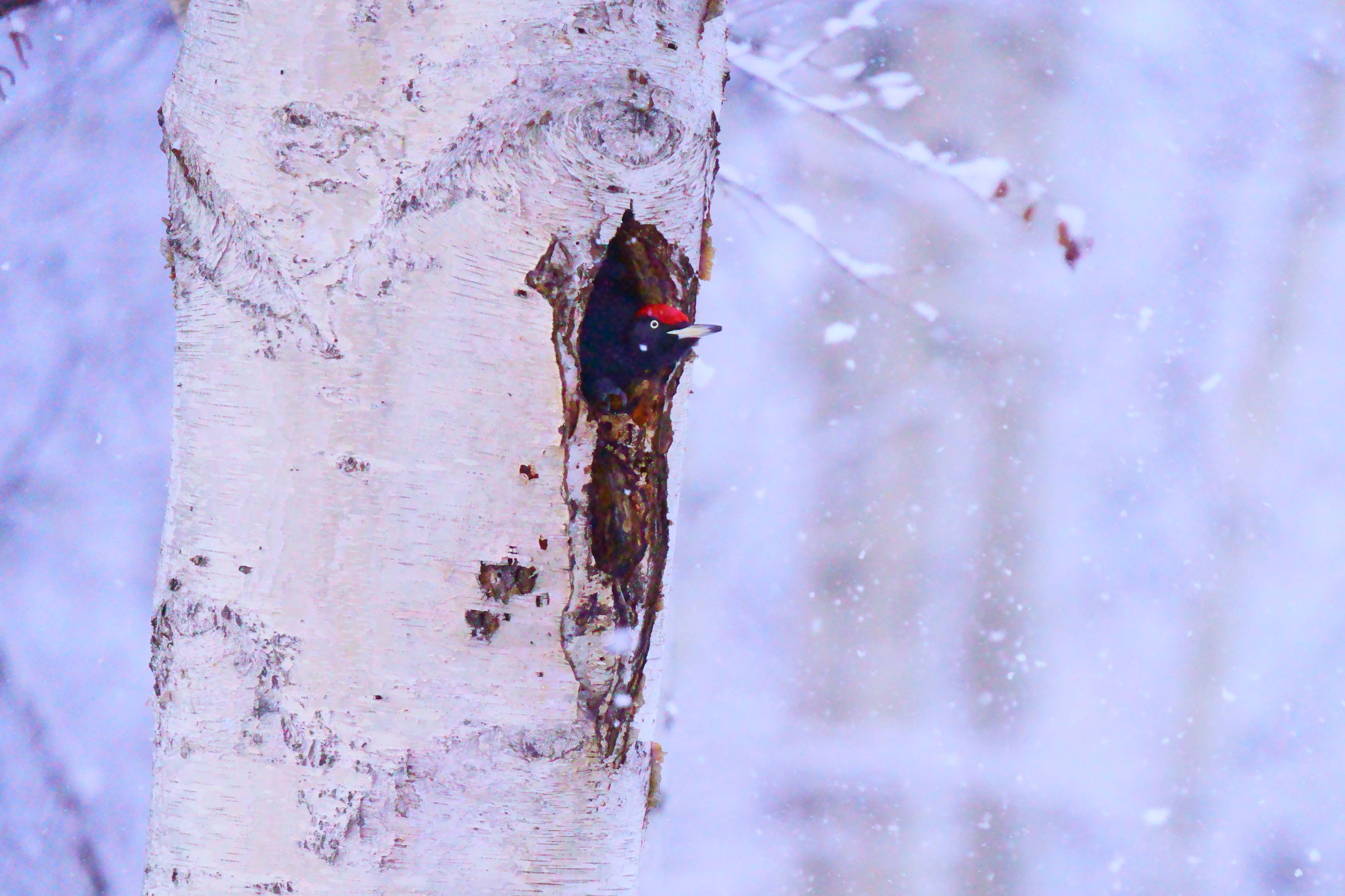 クマゲラが塒から餌取に飛び立つ前の光景です。 降り注ぐ雪に飛び立つのを躊躇し、長い沈黙の後に飛び立ちました。