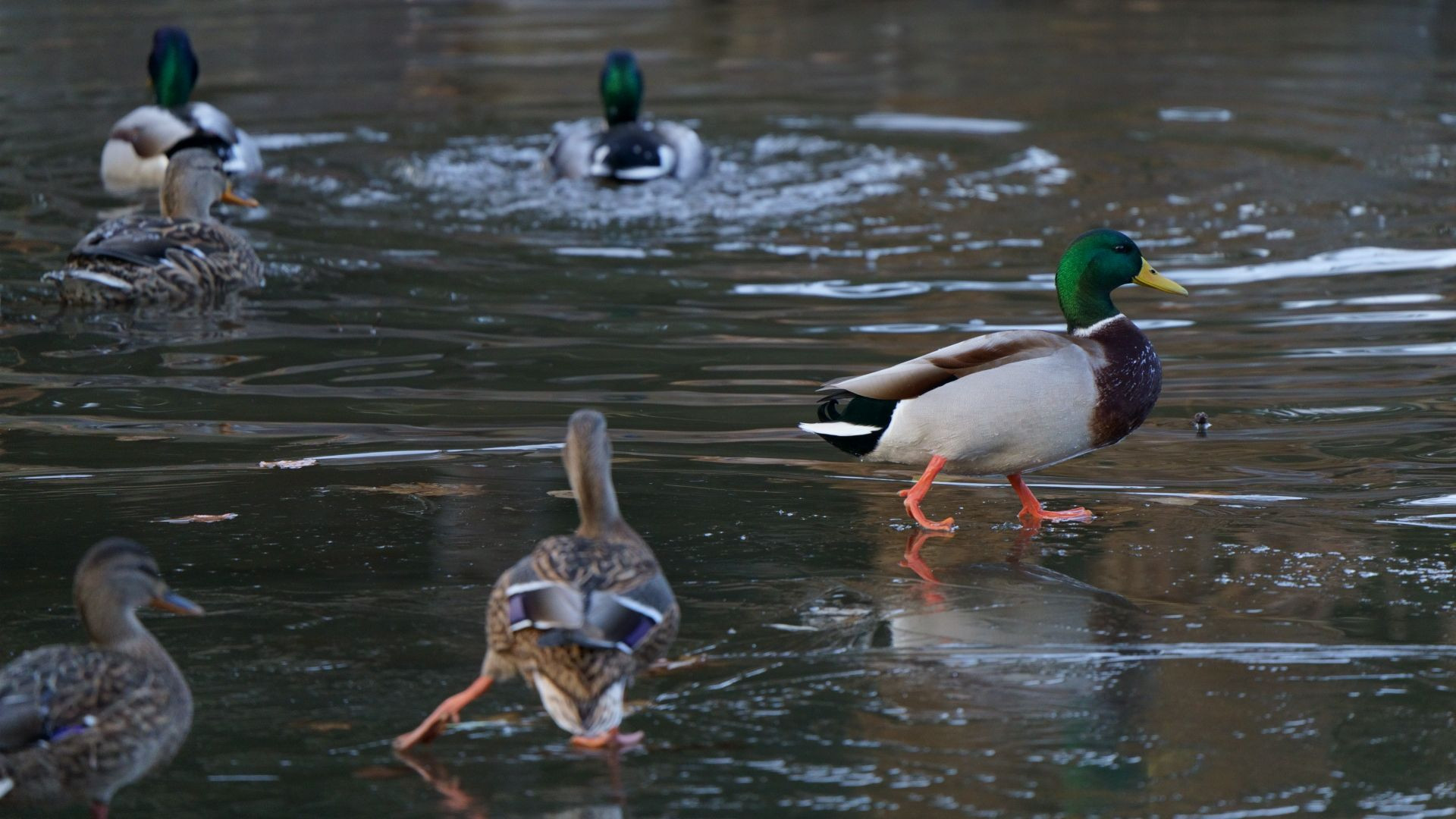 札幌の中島公園の菖蒲池が凍り始めました。手前のメスは滑りながら歩いていました(2020年12月13日撮影)。