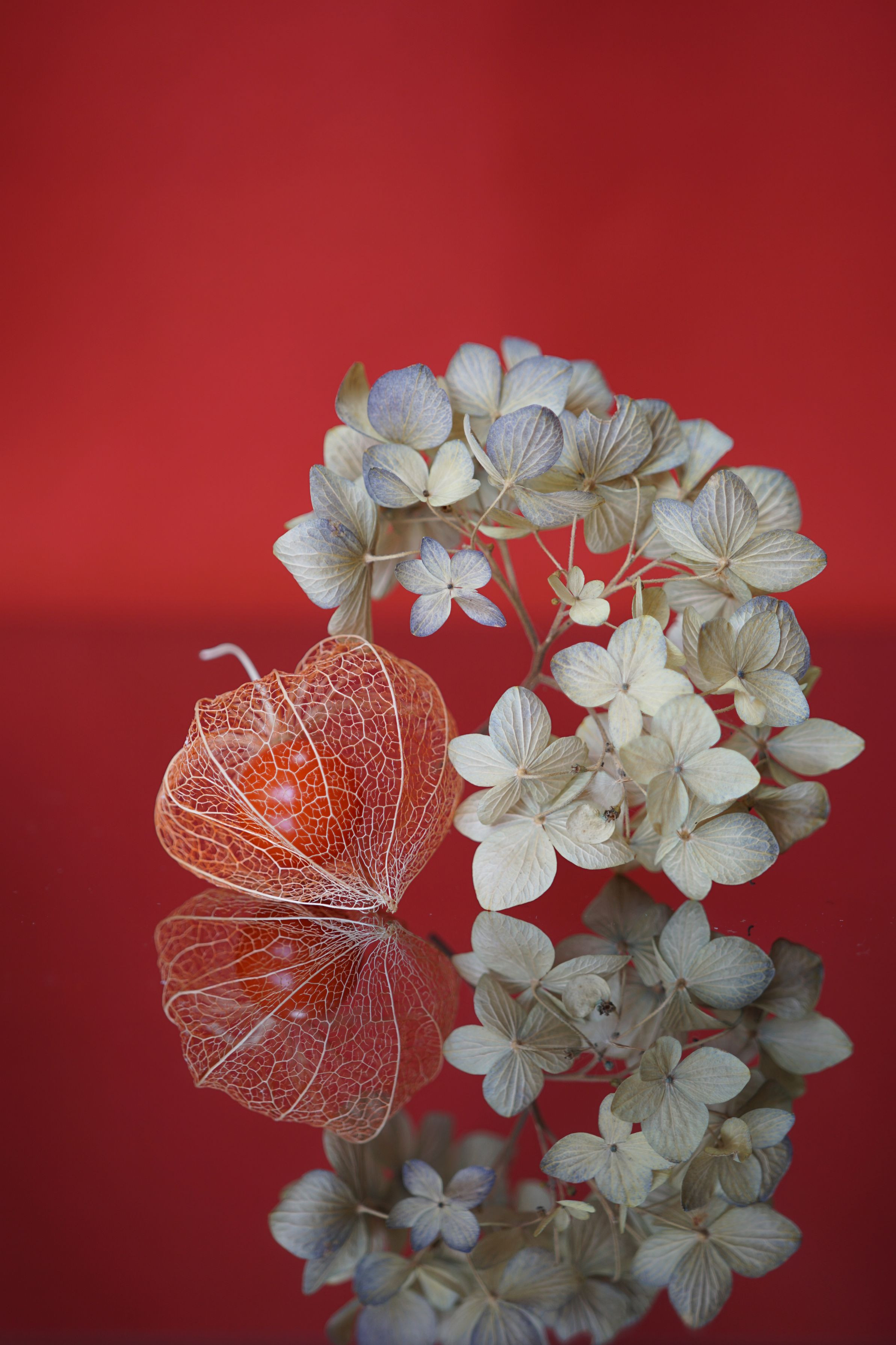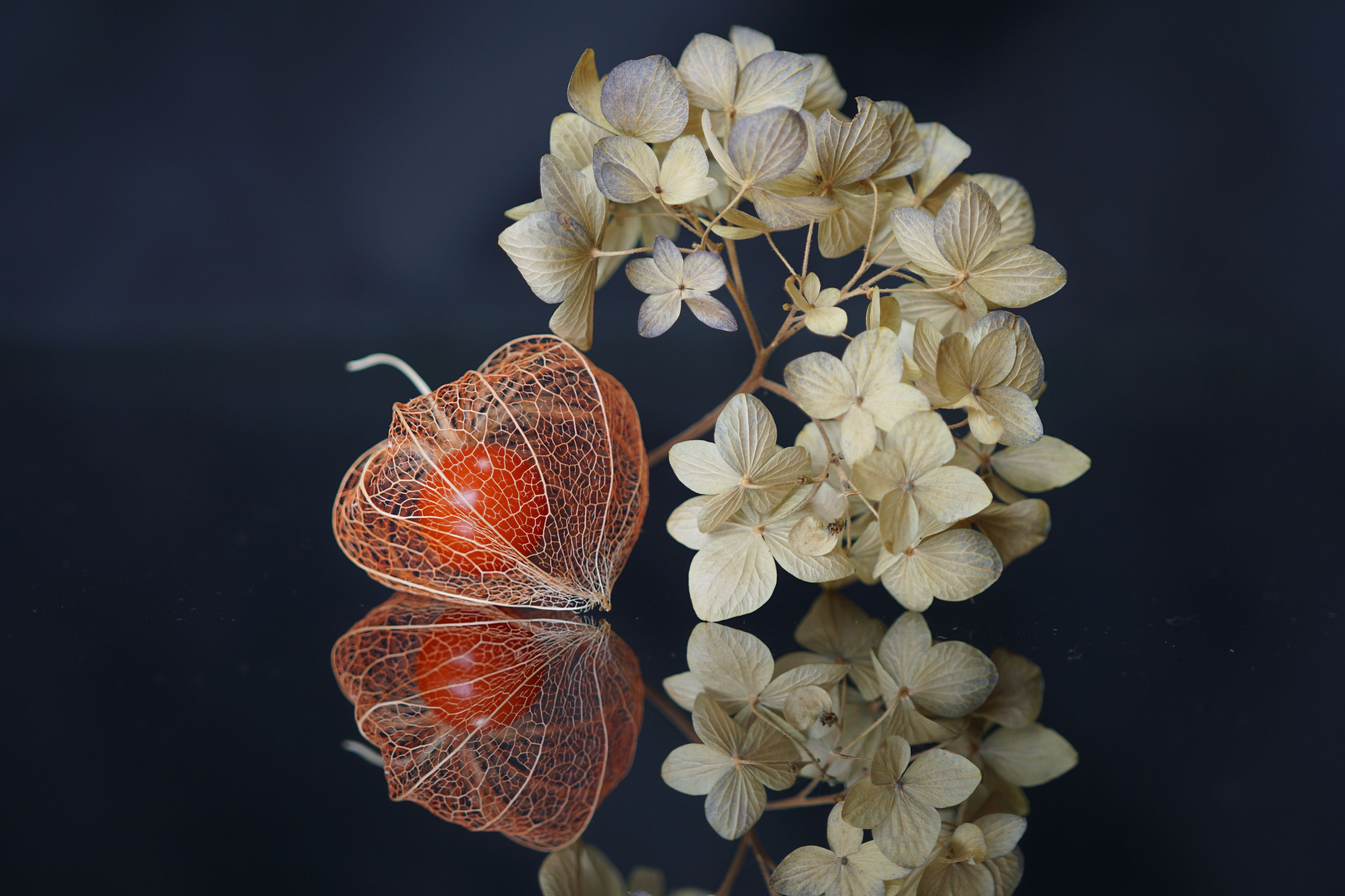 網ほおずきと枯れあじさい