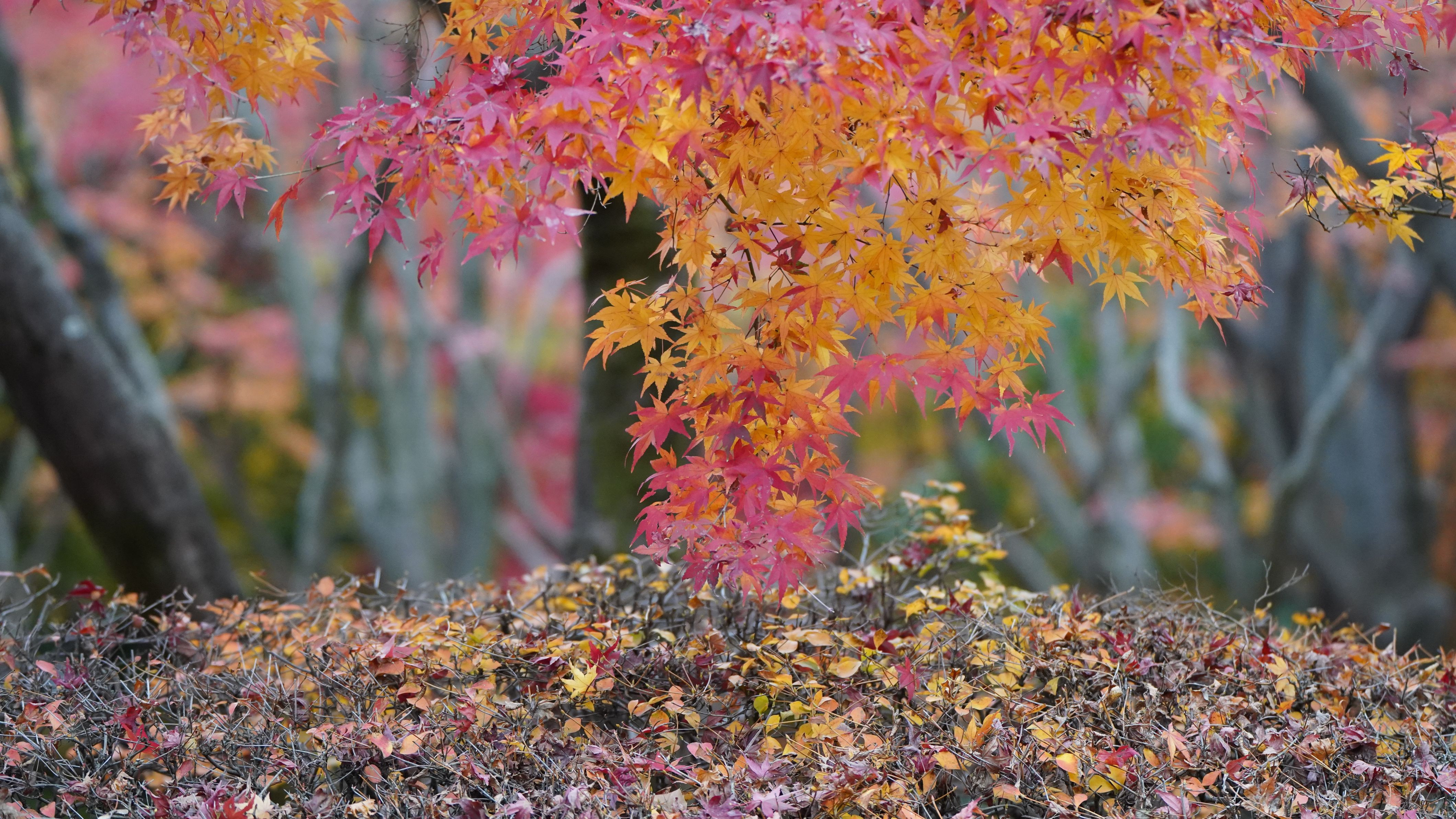 北の丸公園で撮影した写真です。 紅葉したモミジが宝物のように枯れた木に積もっています。