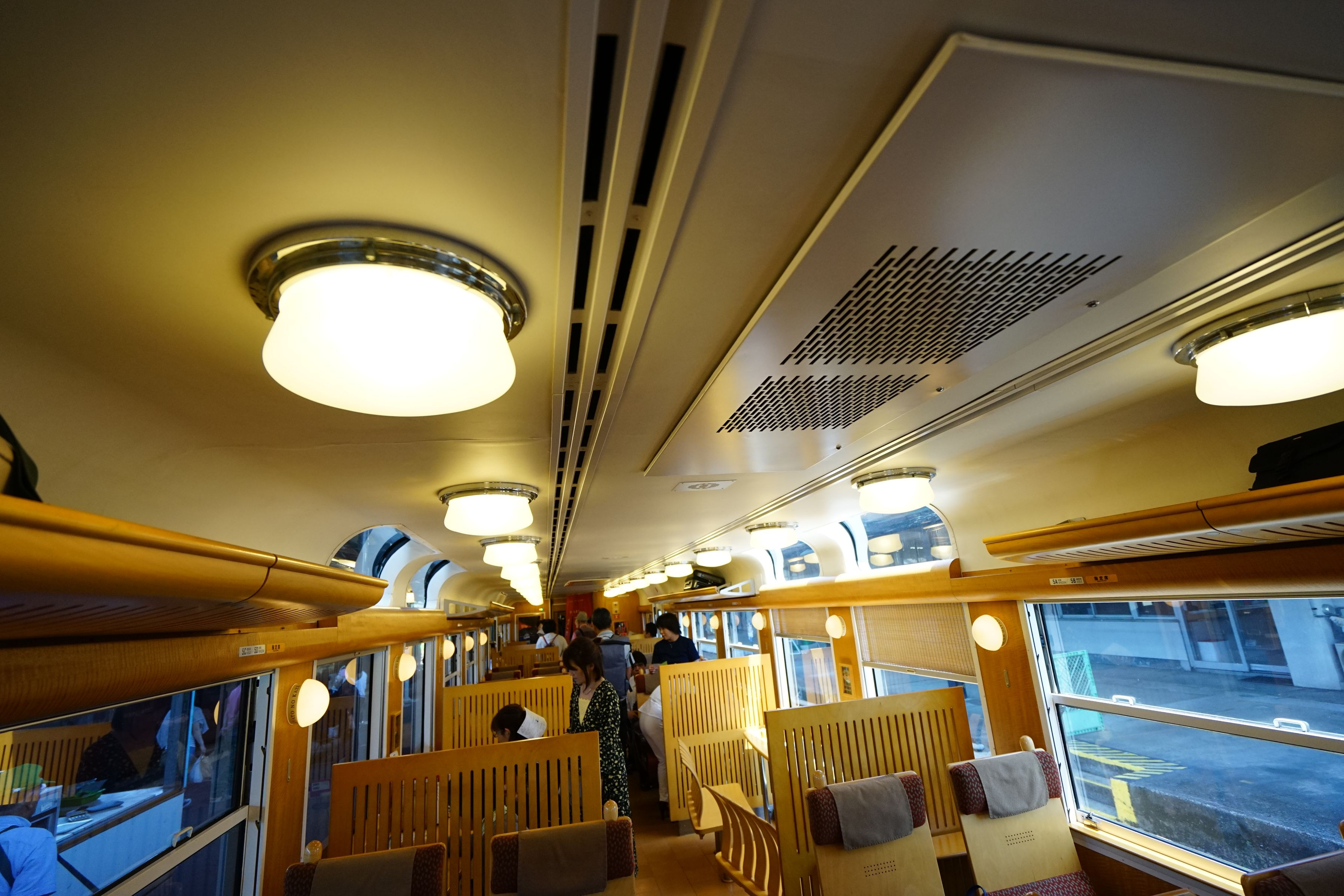 JR九州の特急列車に乗りました。車内はレトロ風に仕上がっていました。九州地方の木材を使用したのでしょうか、いい雰囲気になっています。