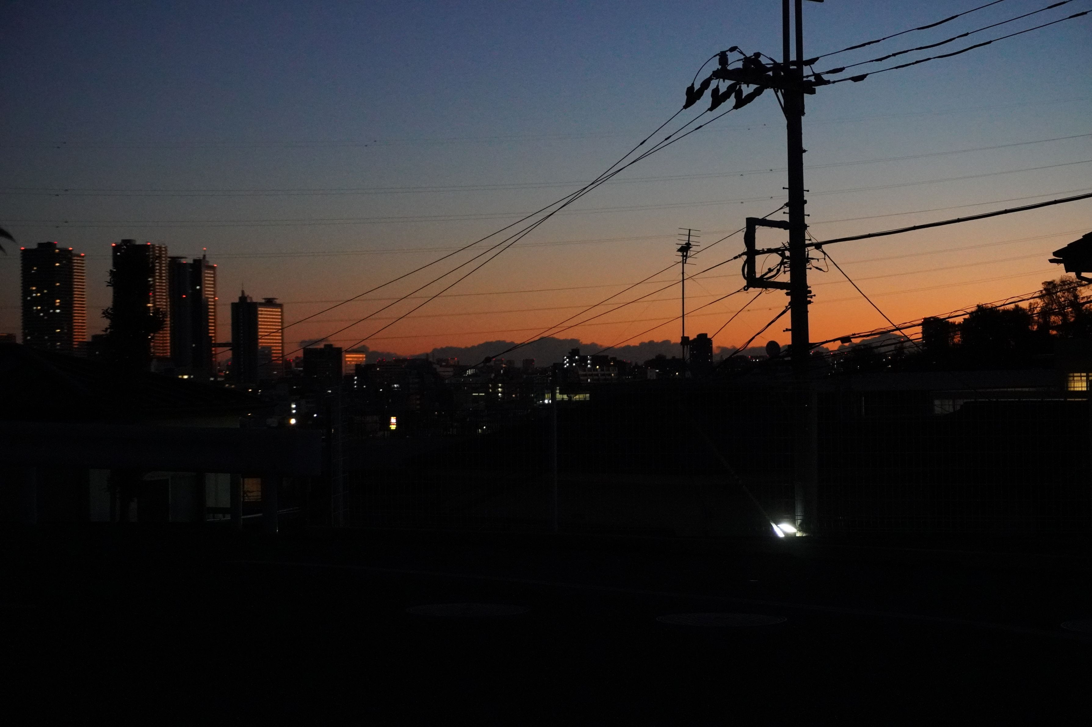 見晴らしの良い高台からの風景 民家の明かりも少なく朝焼けが映えているように感じる