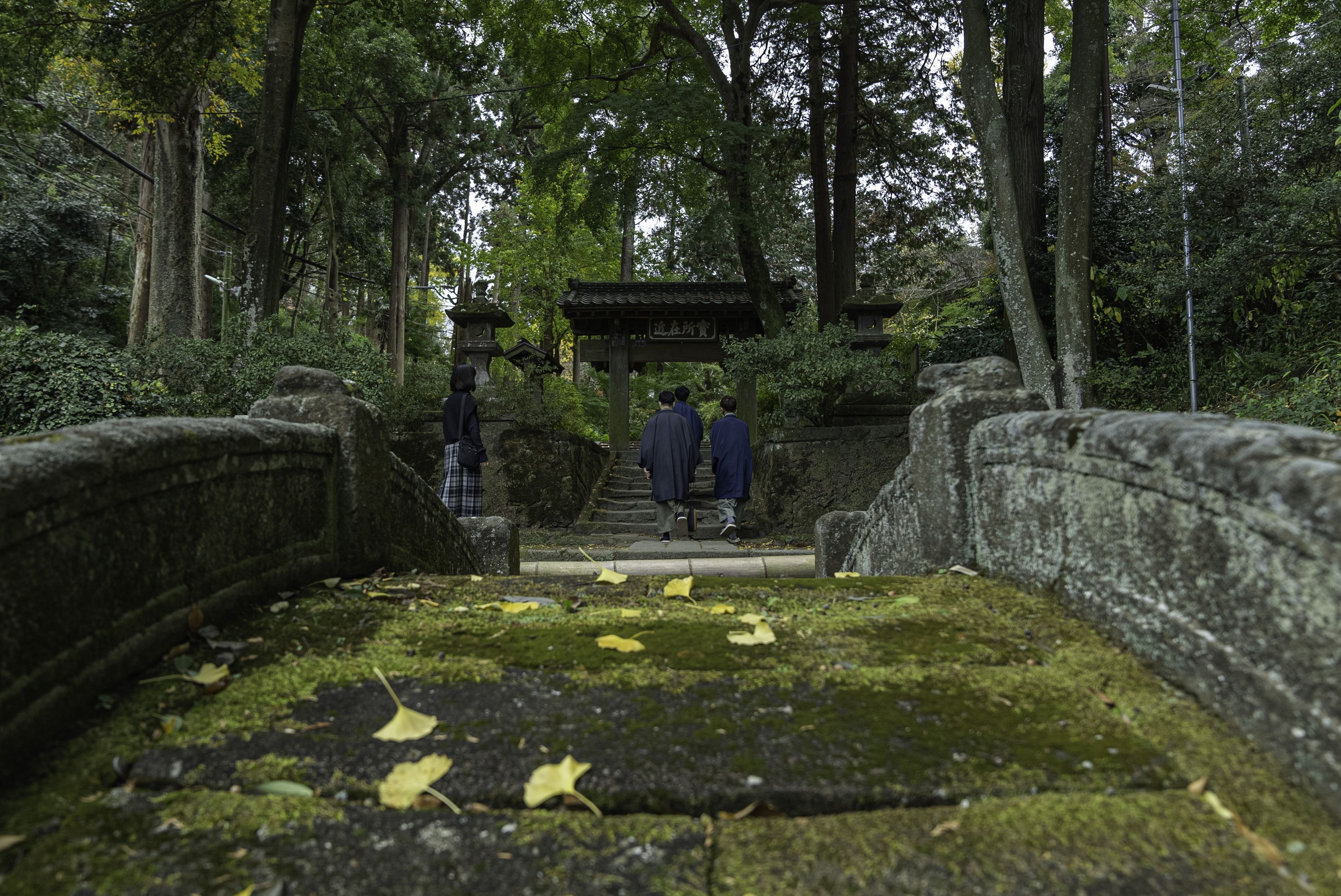「寶所在近」の額を掲げた浄智寺総門に向かって石段を上ろうとする和服姿の青年達。 その後ろ姿を見つめる1人の女性 …… 彼女の眼は、憧れ!疑惑!驚き!嫉妬! さ~どれでしょう!