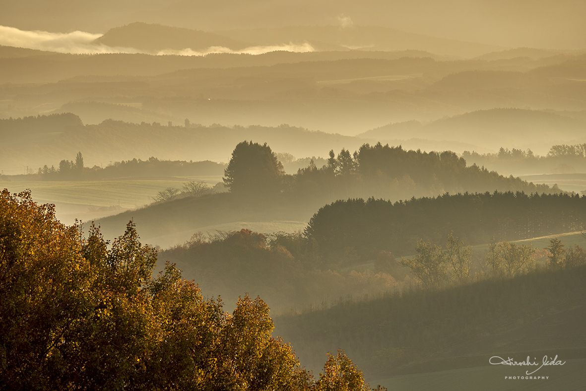 朝霧シーズン後半です。丘の重なり具合を望遠でグラデーションにしました