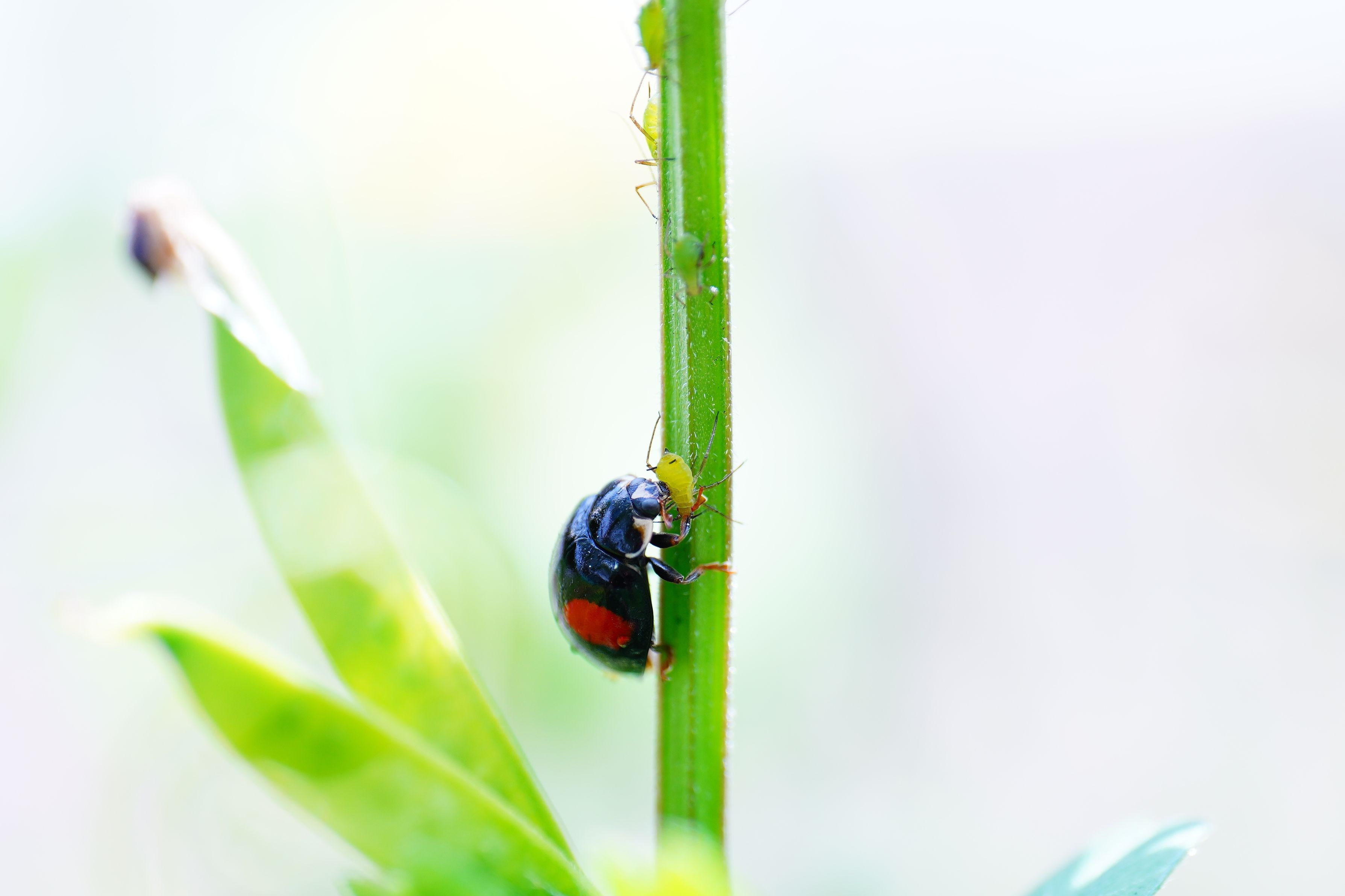 花撮りの合間に撮った昆虫がいくつかありますが、特に印象的だったものを1枚選んでみました。(拡大すると噛んだ跡が見えます) アブラムシの天敵とは聞いていましたが本当に襲っているのは初めて見ました。 コロナの天敵になってくれないかな。