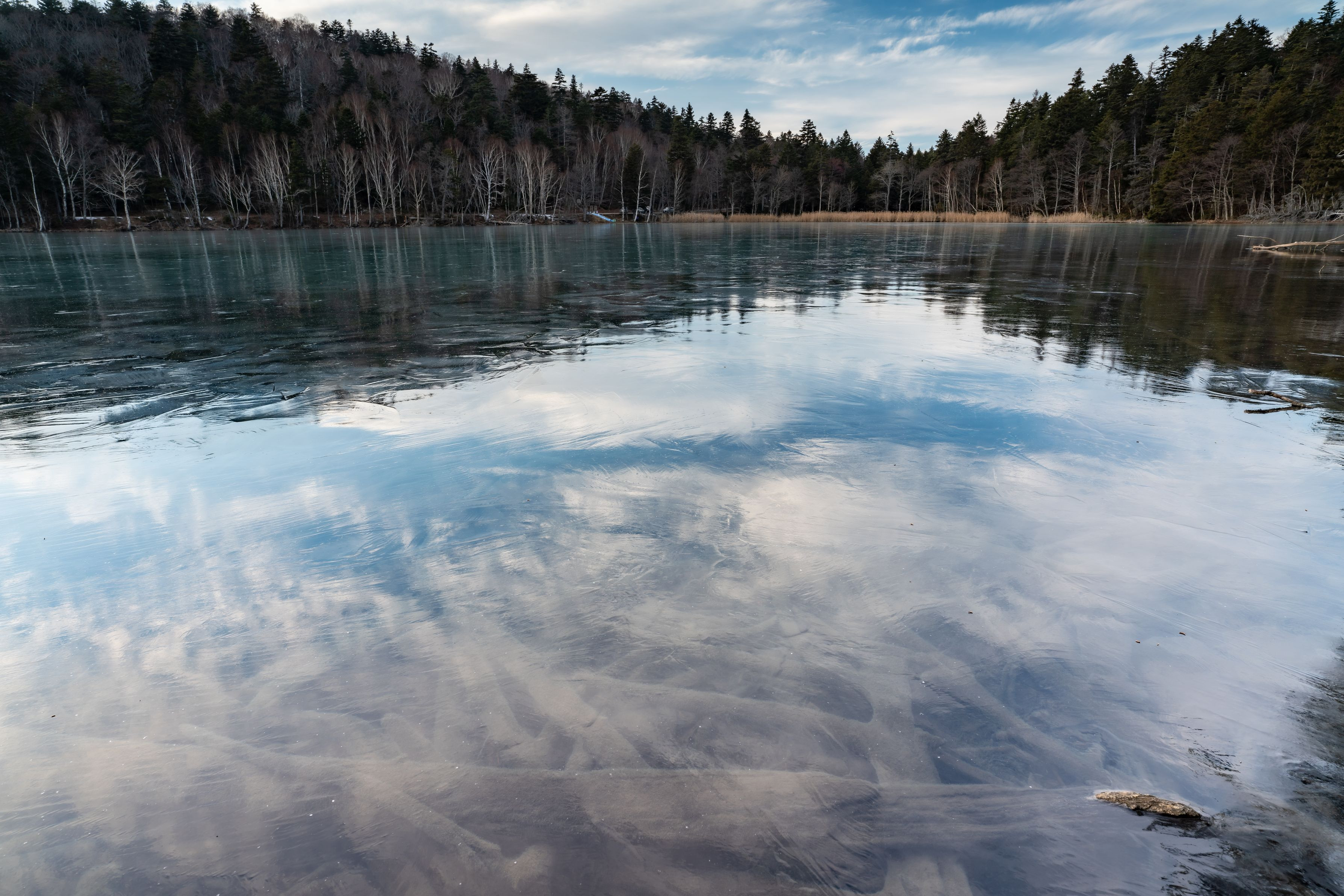 凍り付いた湖面に空がよく映る。この青はどちらのものだろうか。