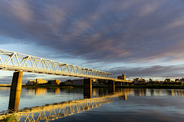早朝の多摩川鉄橋 世間の様子と違って今年の川面はずっと穏やかでした