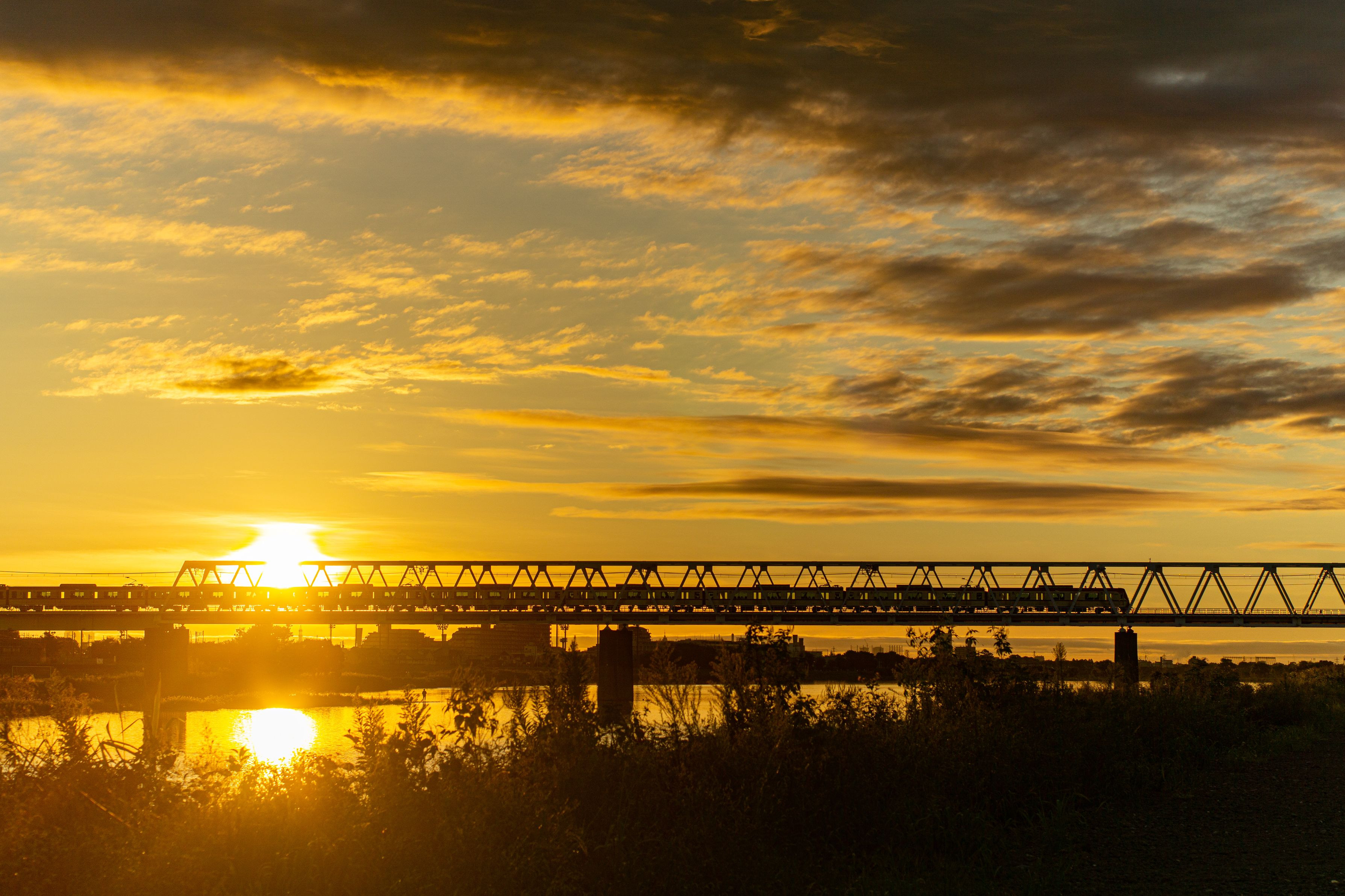 早朝の多摩川鉄橋 世間の様子と違って今年の川面はずっと穏やかでした