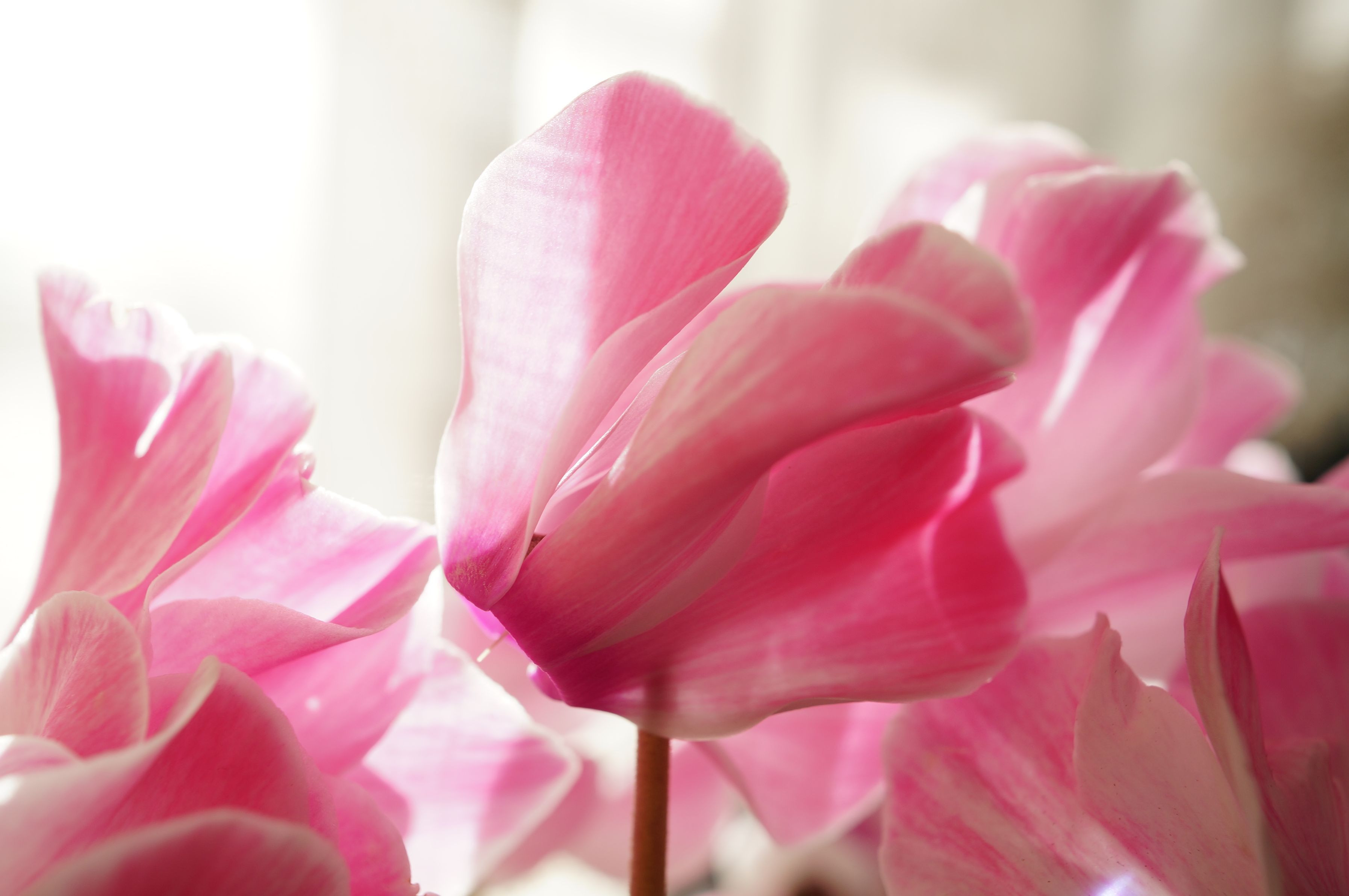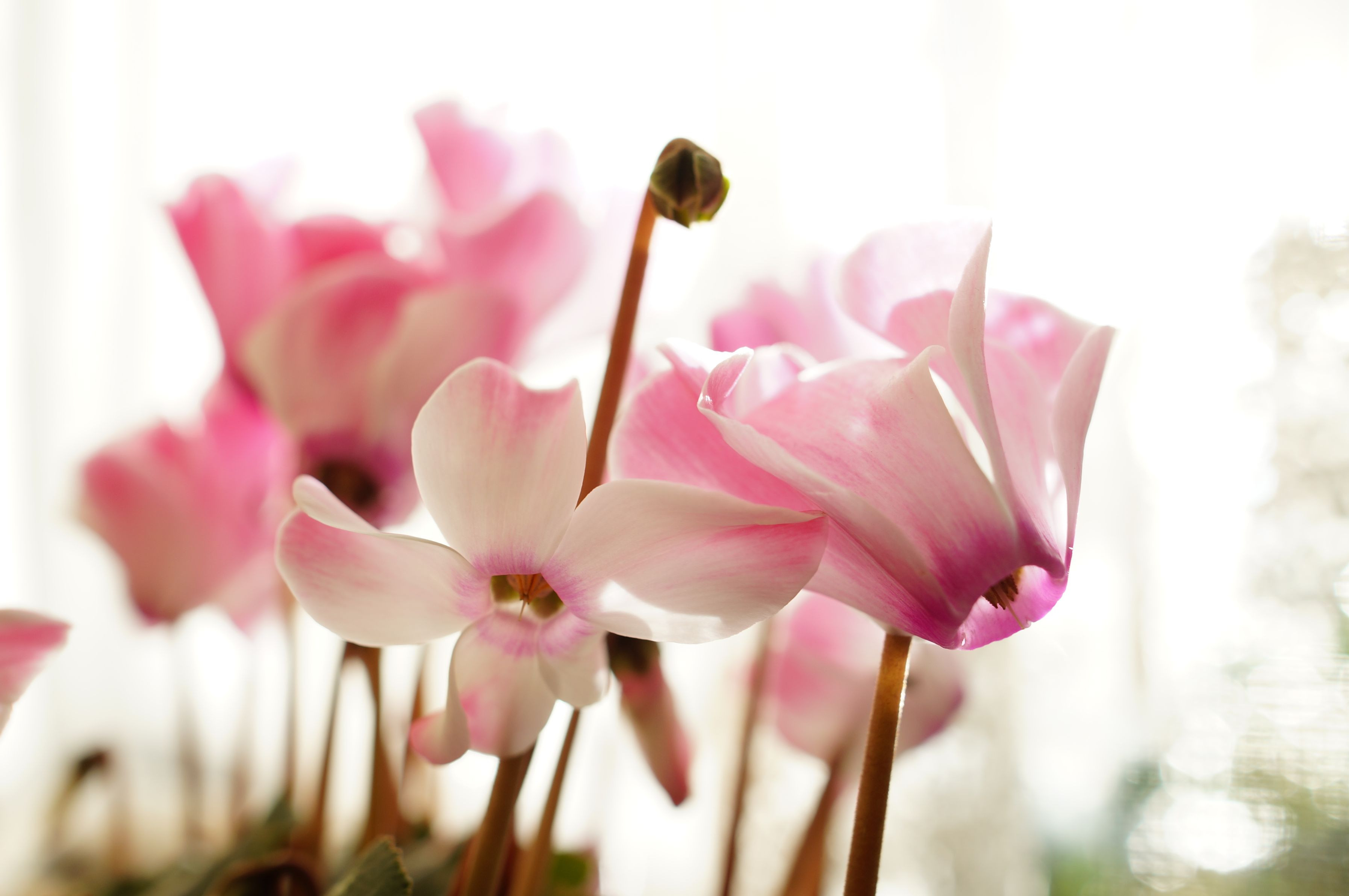 朝の光の中、窓辺を彩るシクラメン