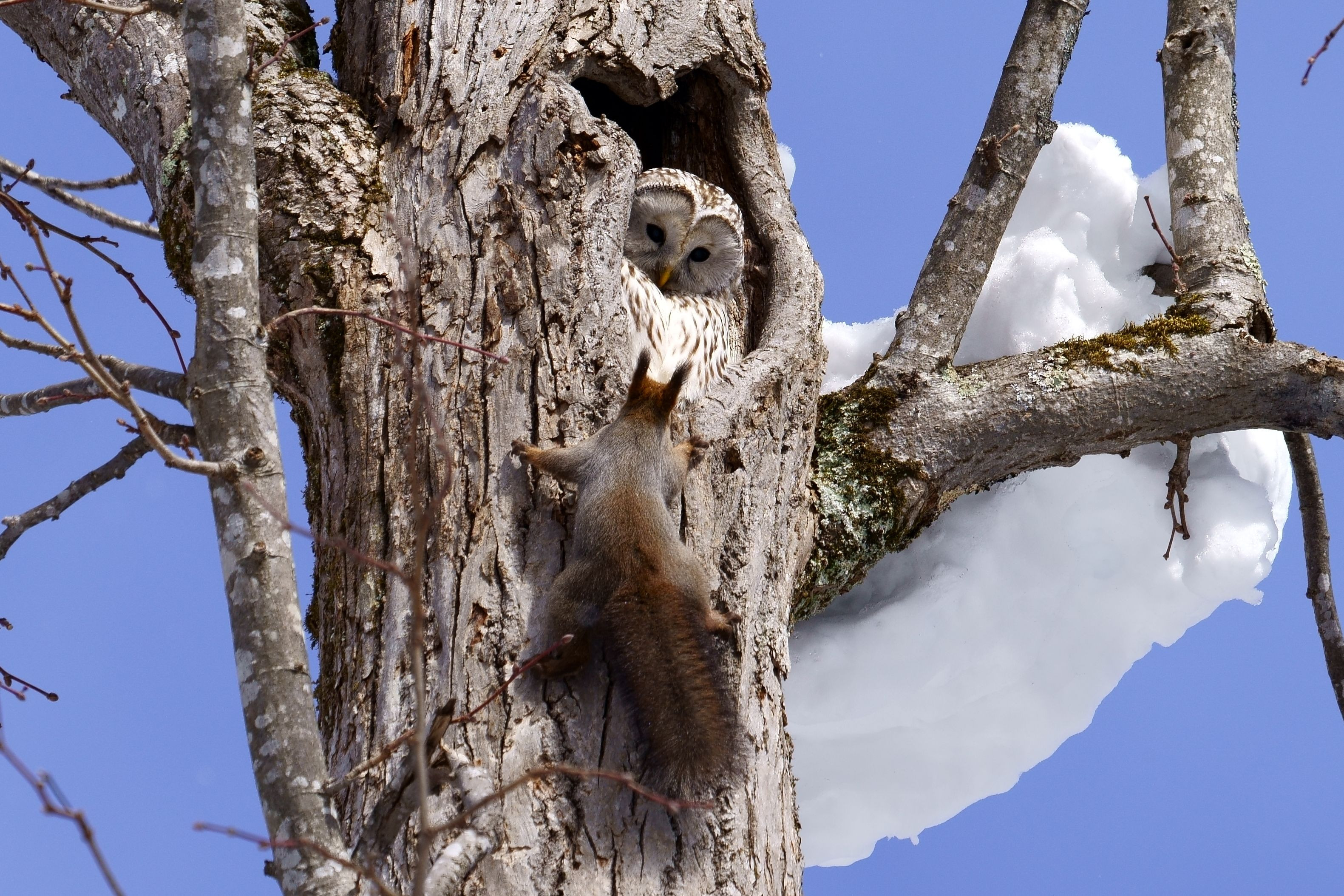 エゾフクロウとエゾリスがばったりと出会ってしまいました。 一瞬時が止まったかのようにお互い見つめ合ってました。