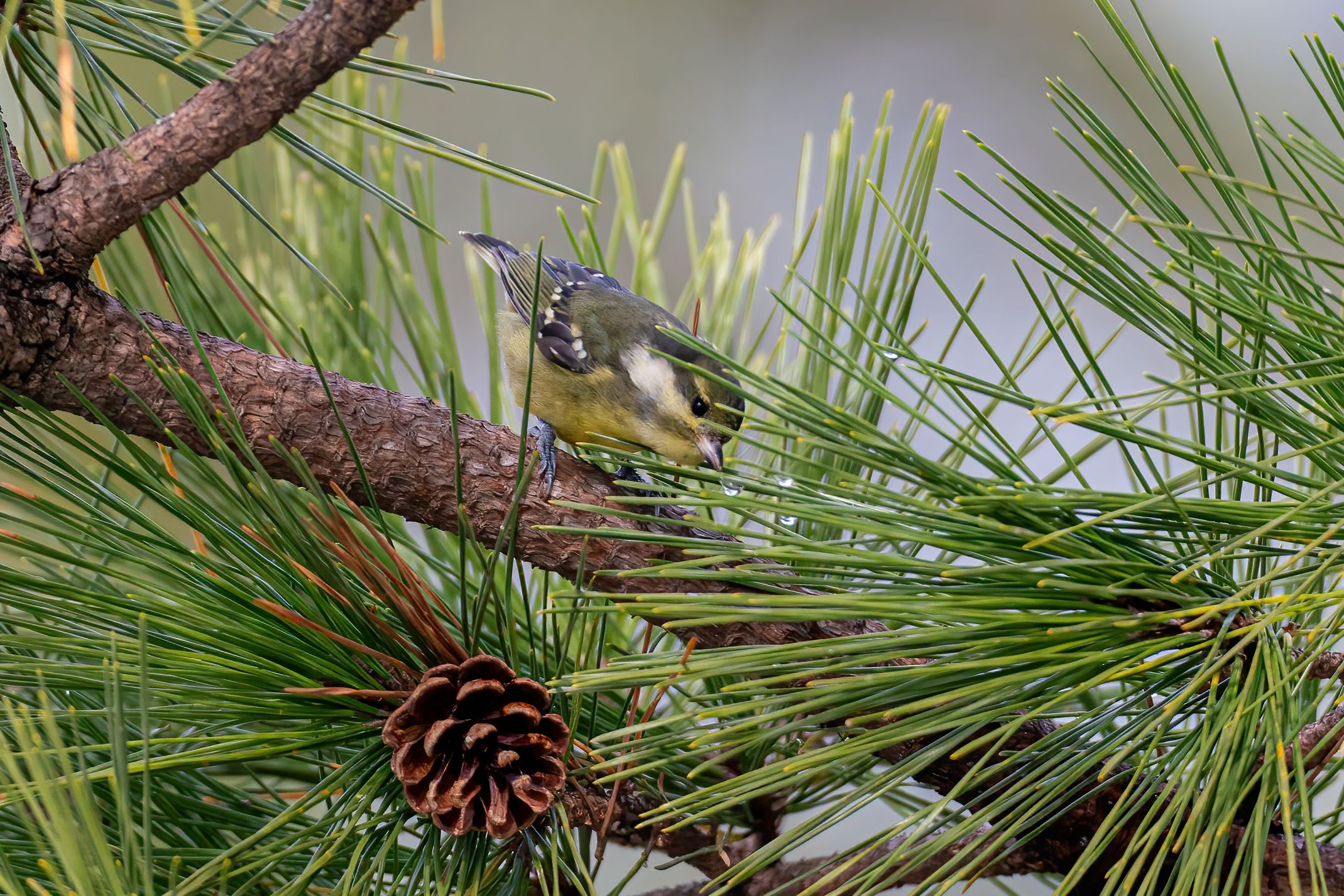 キバラガラ。 今季は各地で見られているみたいです。 写真を撮ってよく見ると松の葉についた水滴を飲んでいました。