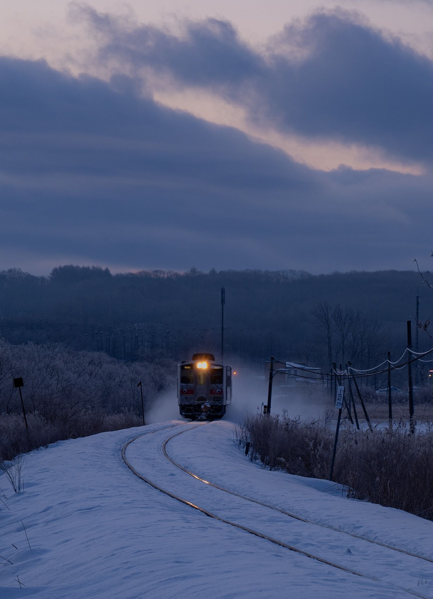さらっと雪が降った朝 始発の列車が跳ね上げて通過する