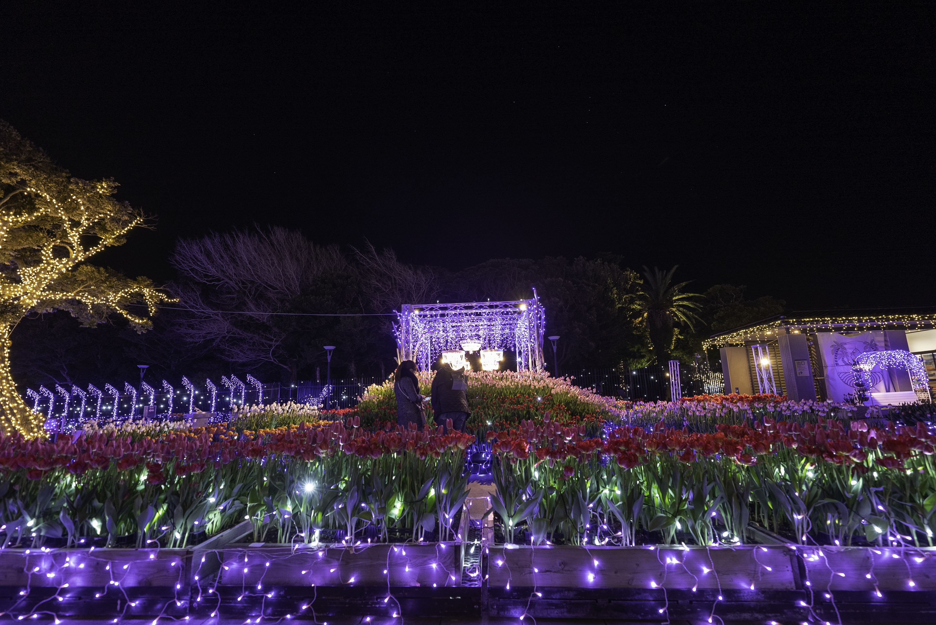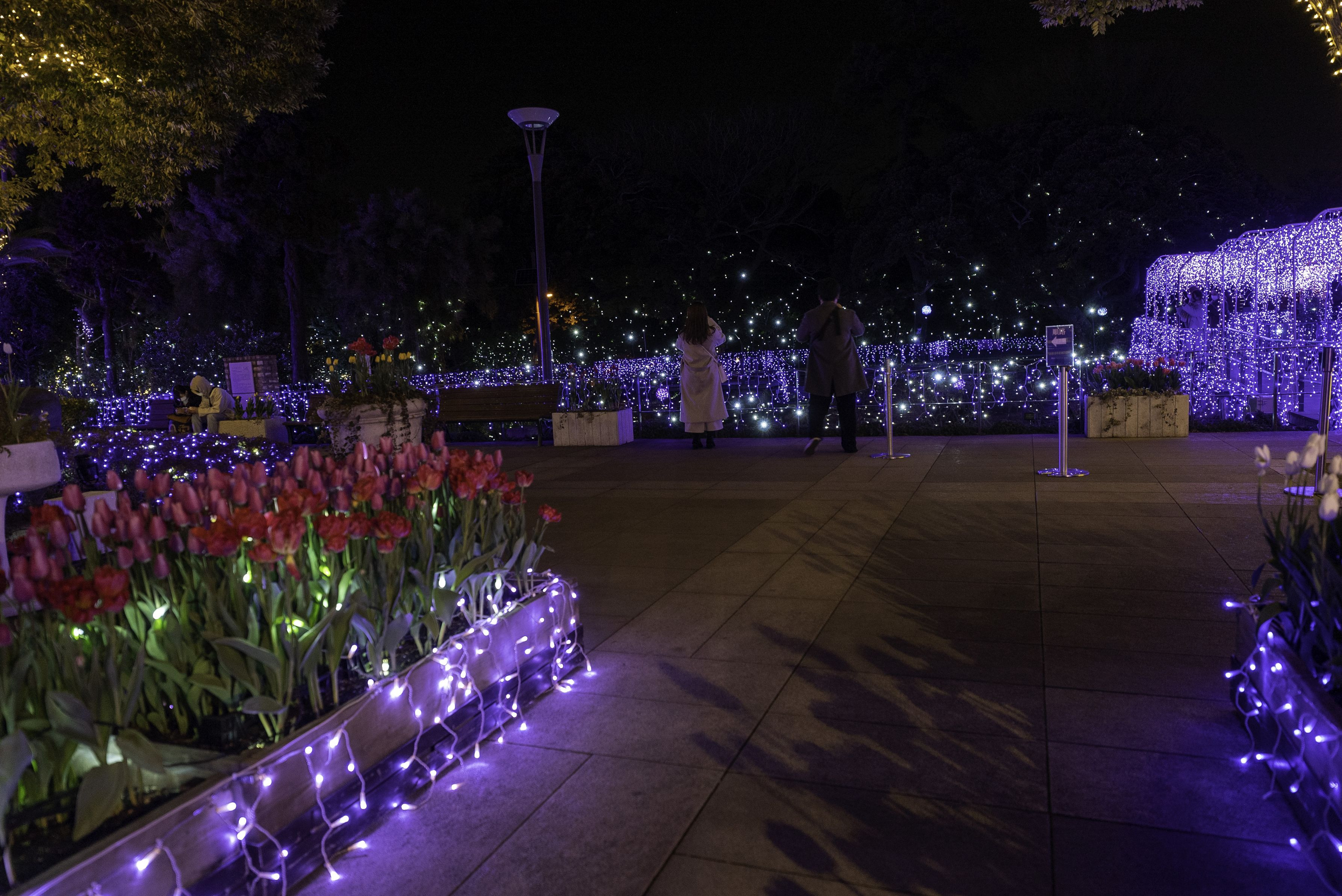 サムエル・コッキング苑の入り口近くに、 イルミネーションで飾られた庭園がある。 光に照らされた花は、色鮮やかで美しく生き生きとしている。