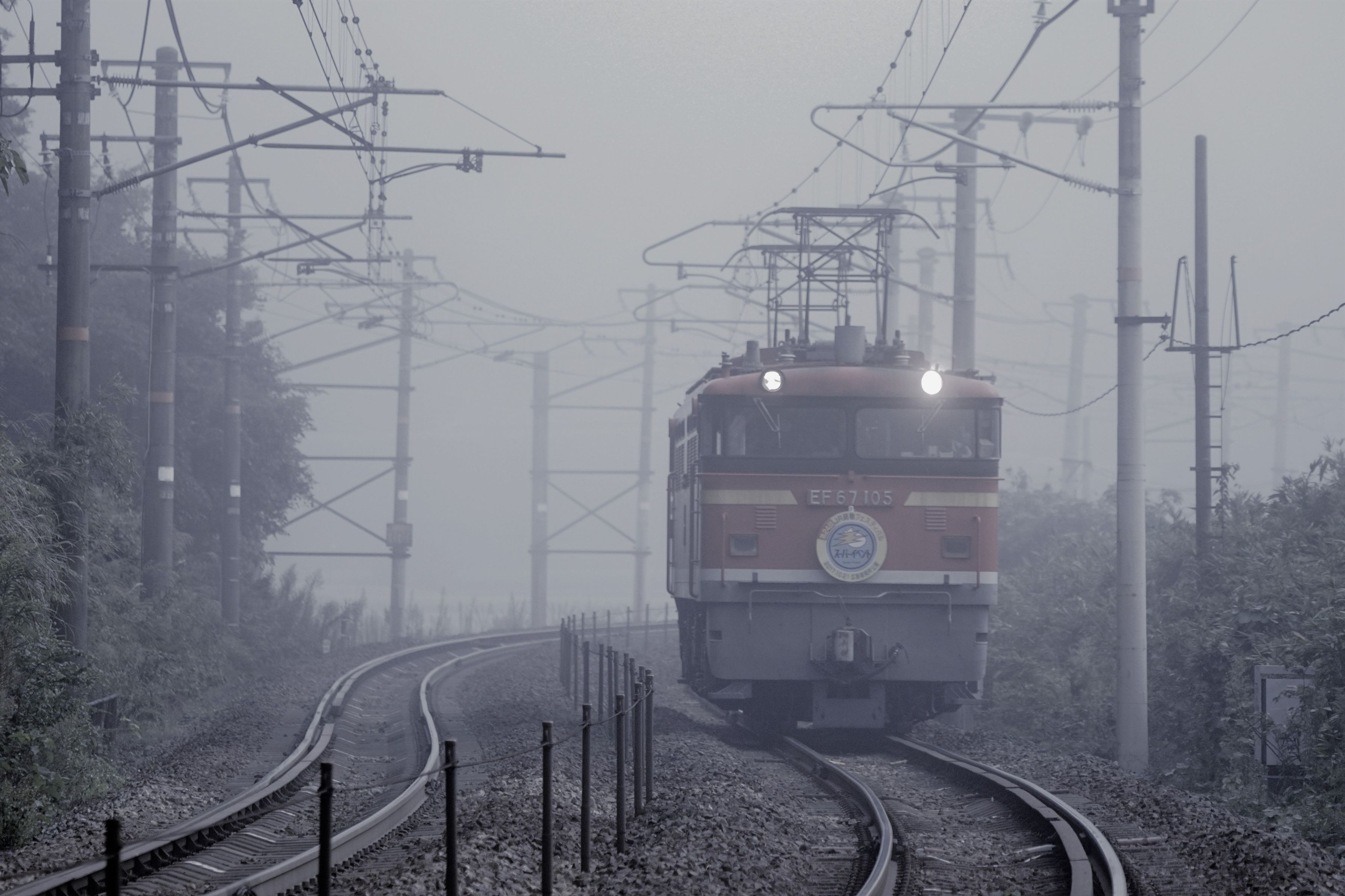 赤い機関車とRedWing 霧のセノハチでEF67と227系の赤が濃霧で霞んでいた フィルターで調整あり