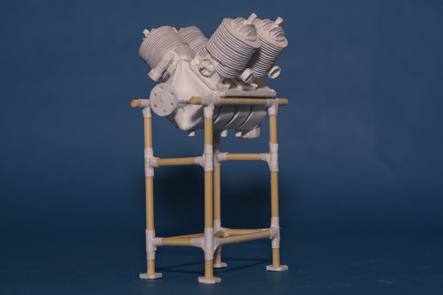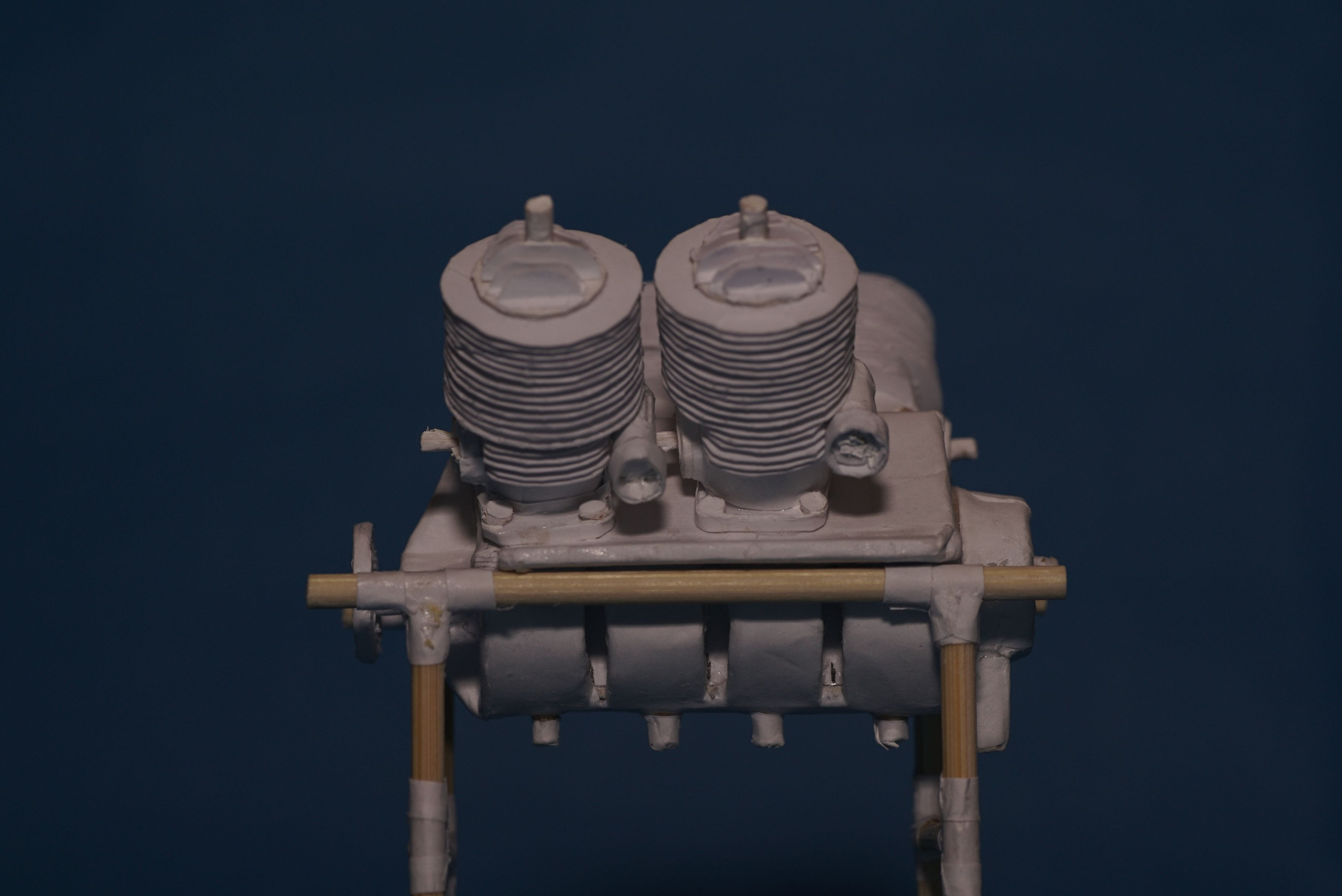 1910年に日本人初の動力飛行をした日野大尉が乗機したグラーデ単葉機のエンジンの1/12スケールフルスクラッチ紙模型を厚紙とコピー用紙を材料に作りました。空冷V型4気筒エンジンです。