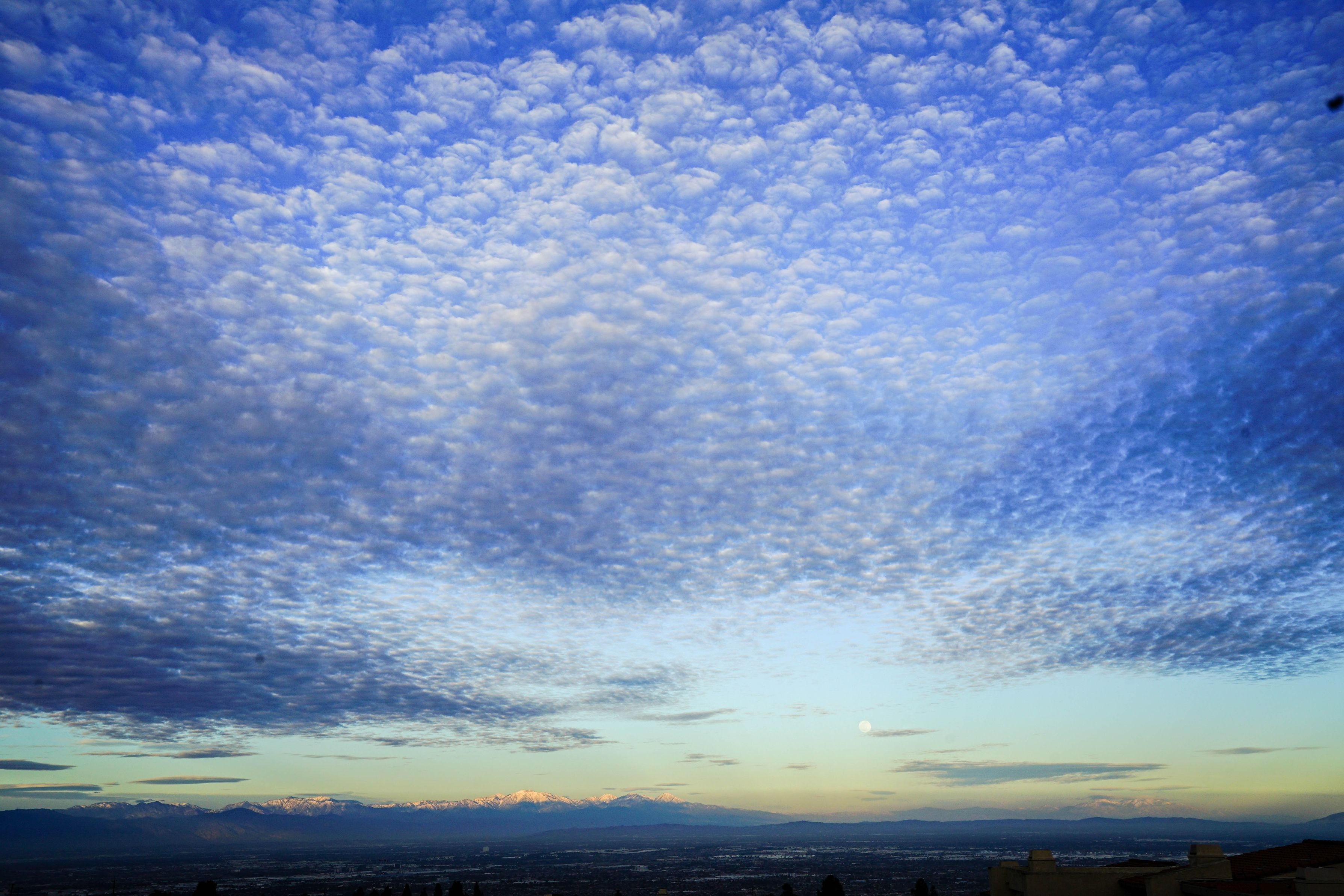 自宅のテラスから撮影、遠くに雪化粧した山、また非常に小さな白い点はシミではなく月です。