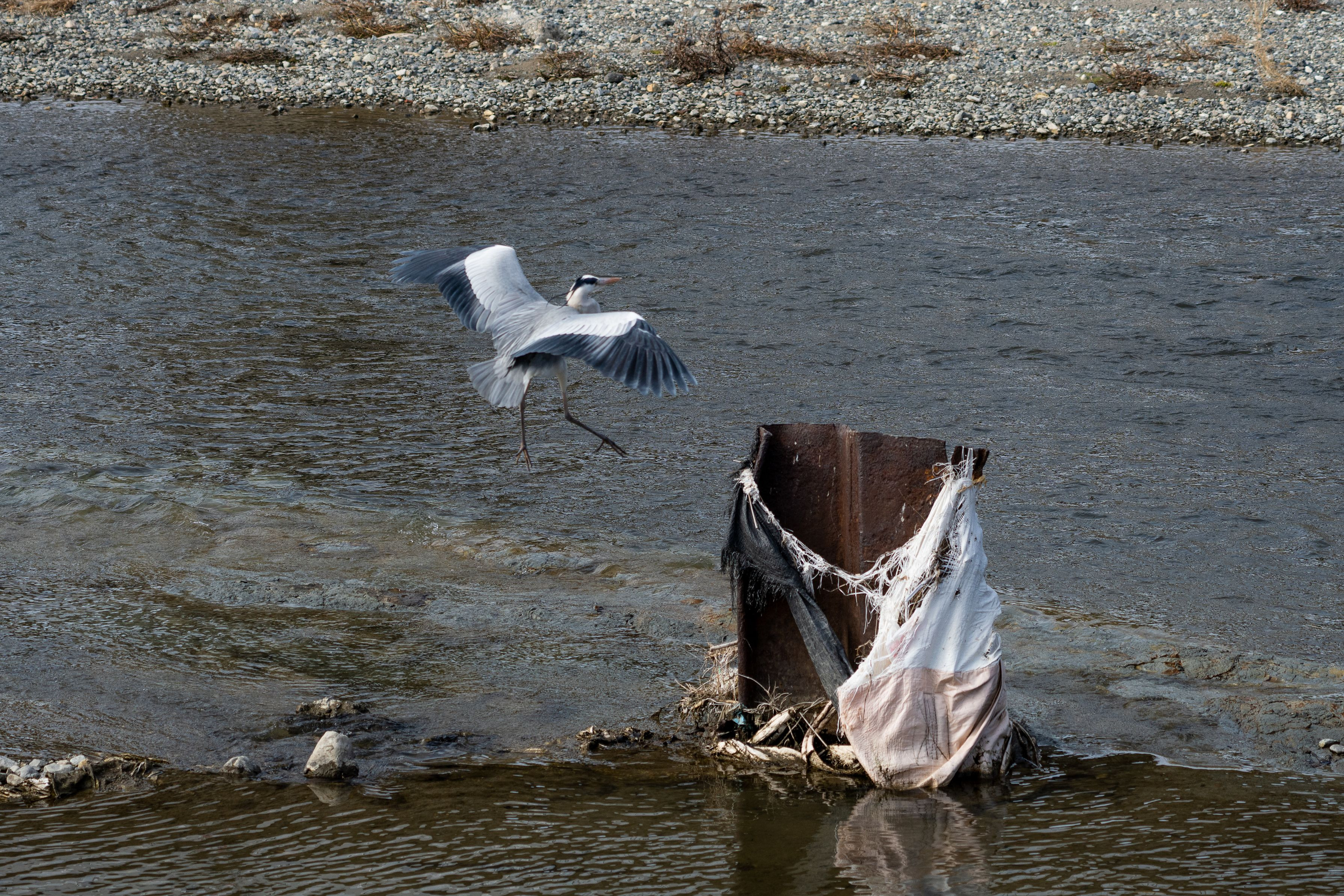 お気に入りの散歩コース。国道にかかる橋からも良く見えるところにある廃棄物?川の増水時に流れてきたのかもしれない。水は澄んで市民の憩いの河原で手入れも頻繁に行われているようだが、この風景がすべてを台無しにしているようで悲しい。