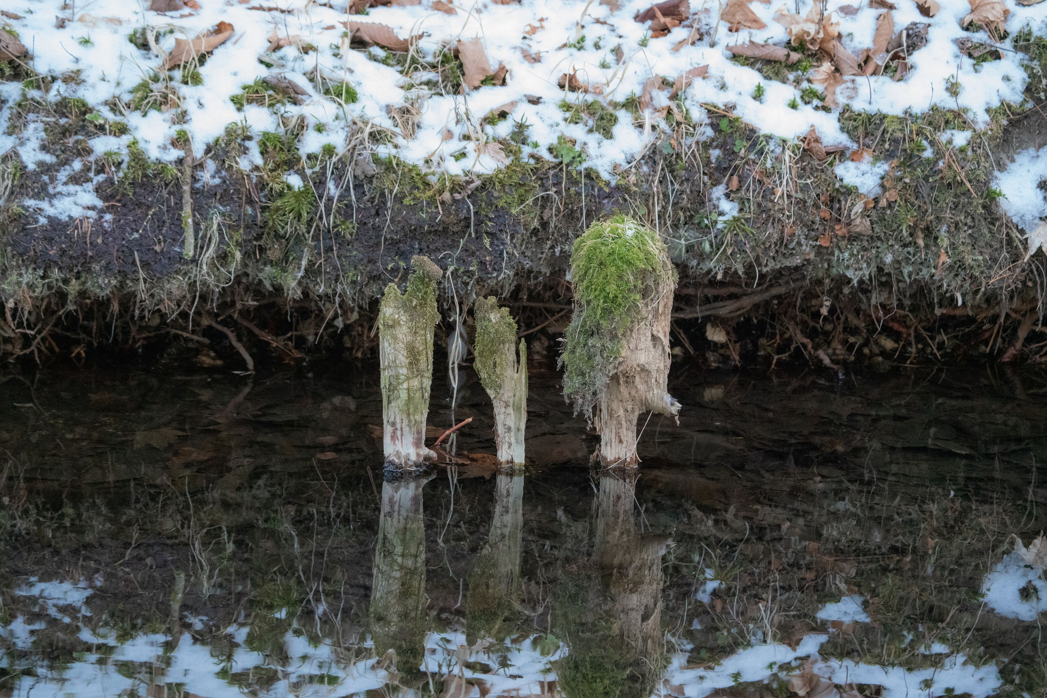野鳥撮影に出掛けた先に流れていた小川。 ふと見てみると、折れた木々が川の中で苔むしていました。 それはまるで、精霊の親子のようにも見えました。