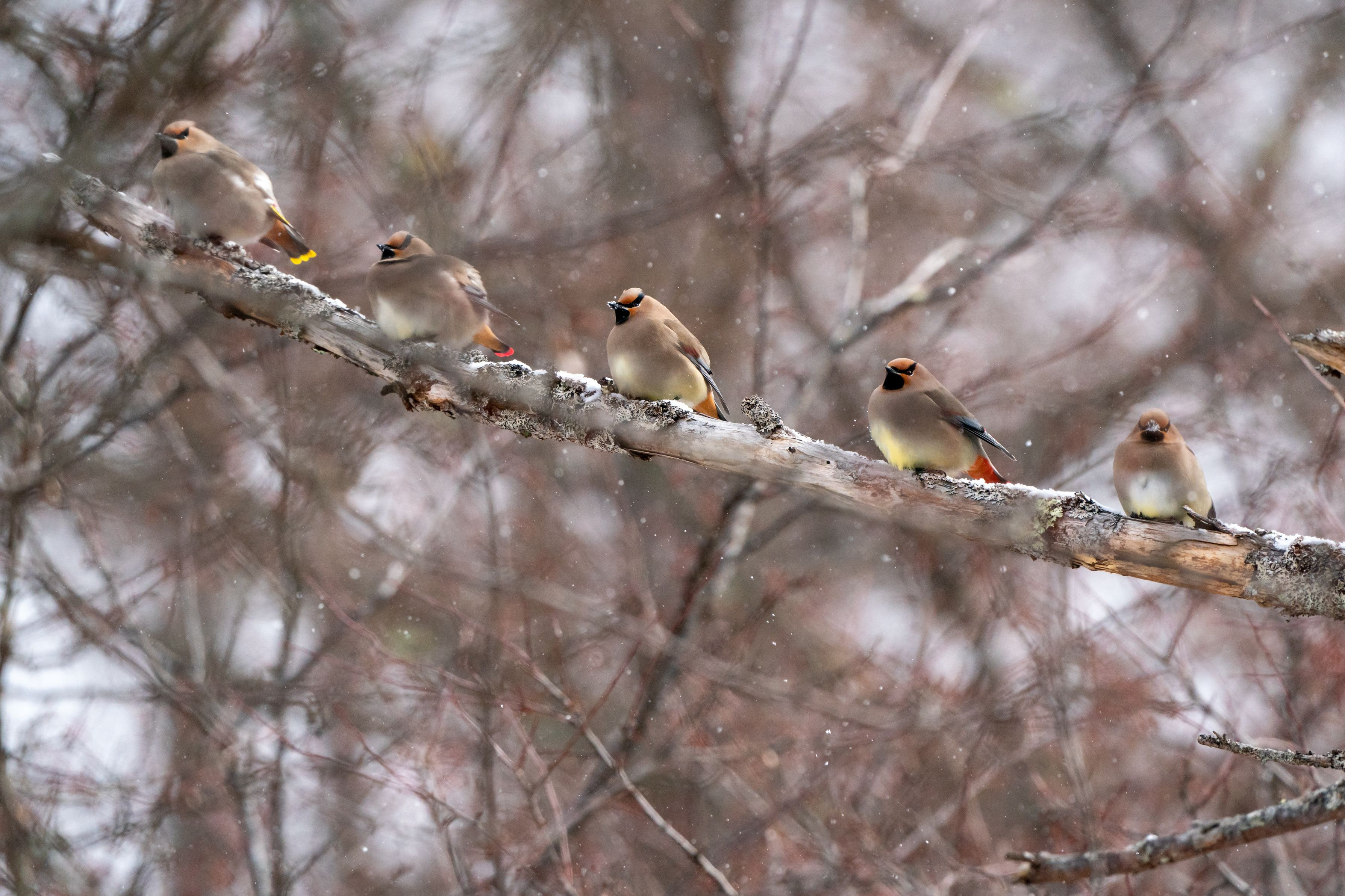 5レンジャク 雪の降る中、レンジャクの一団が 1、2、3、4、5 むむ、これは・・・五レンジャク レッドが4羽、イエローが一羽 でした。