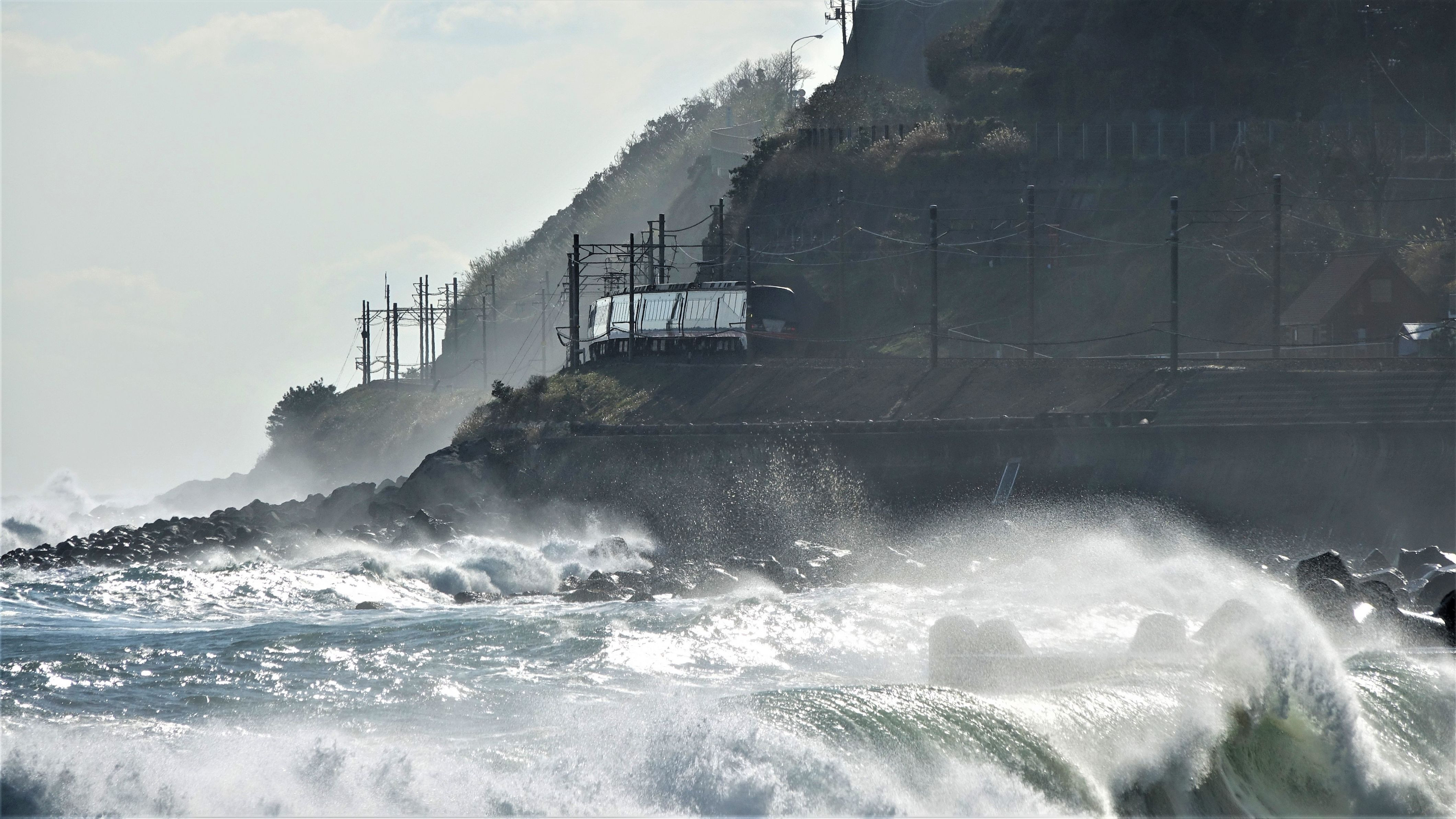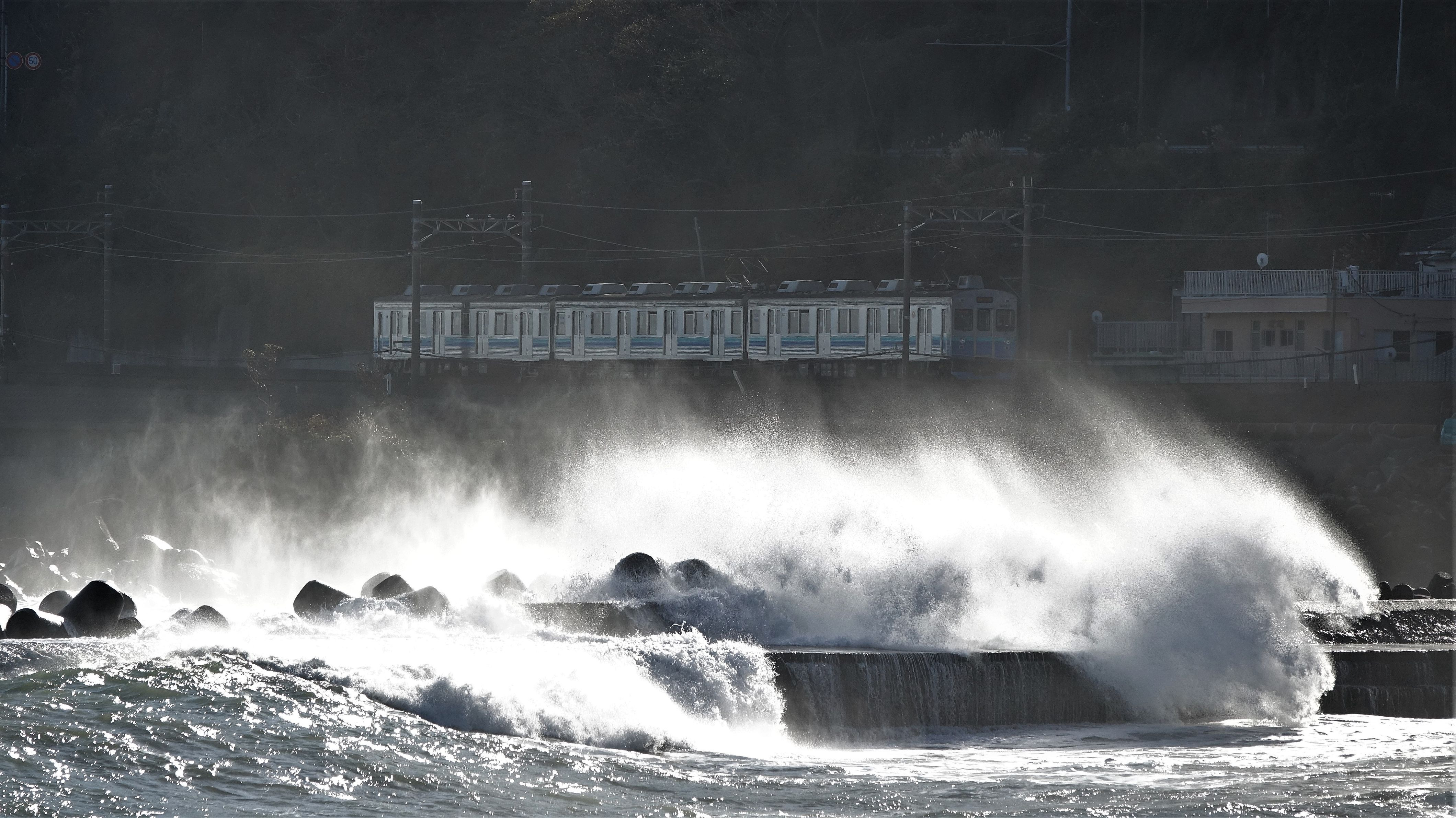 1月25日は大波でした。その大波の海岸線を伊豆急電車は勇猛果敢に突っ走っていました。コロナで河津桜祭りは中止になりました。1月29日、川沿いの桜はまだつぼみでした。