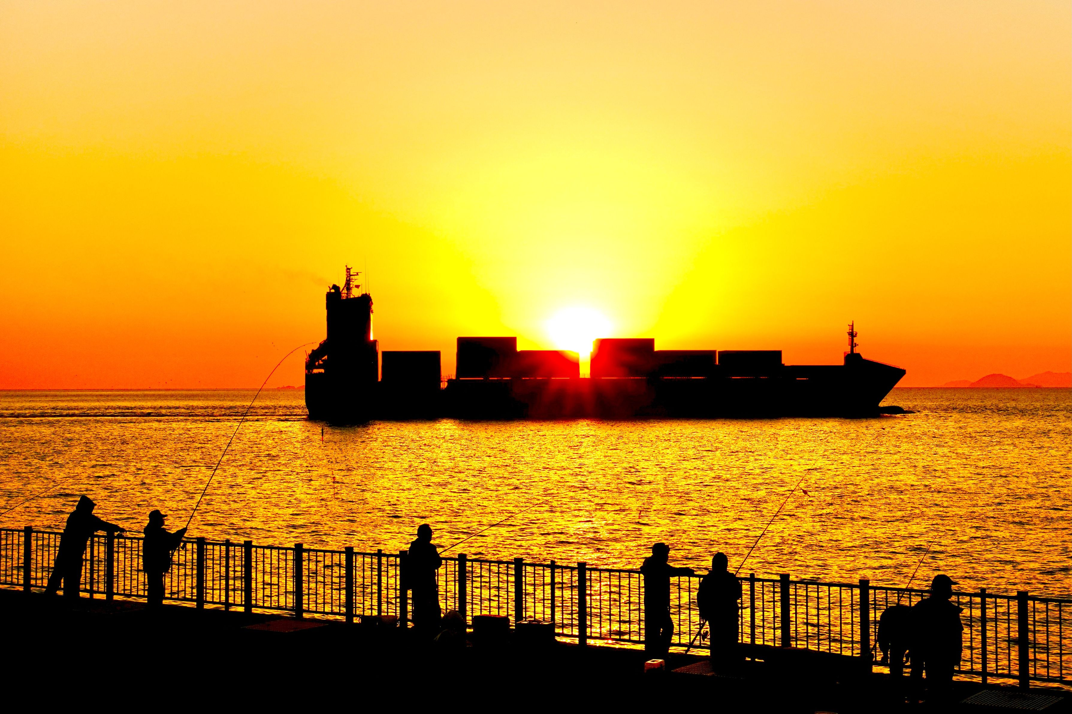 コロナで釣人口が増えているそうです(••) 松山市内の大可賀釣り公園も夕暮れ時に沢山の釣り人が訪れてます♪ 沖合を大きなコンテナ船がゆっくりと通り過ぎて長閑な光景でした(^^)