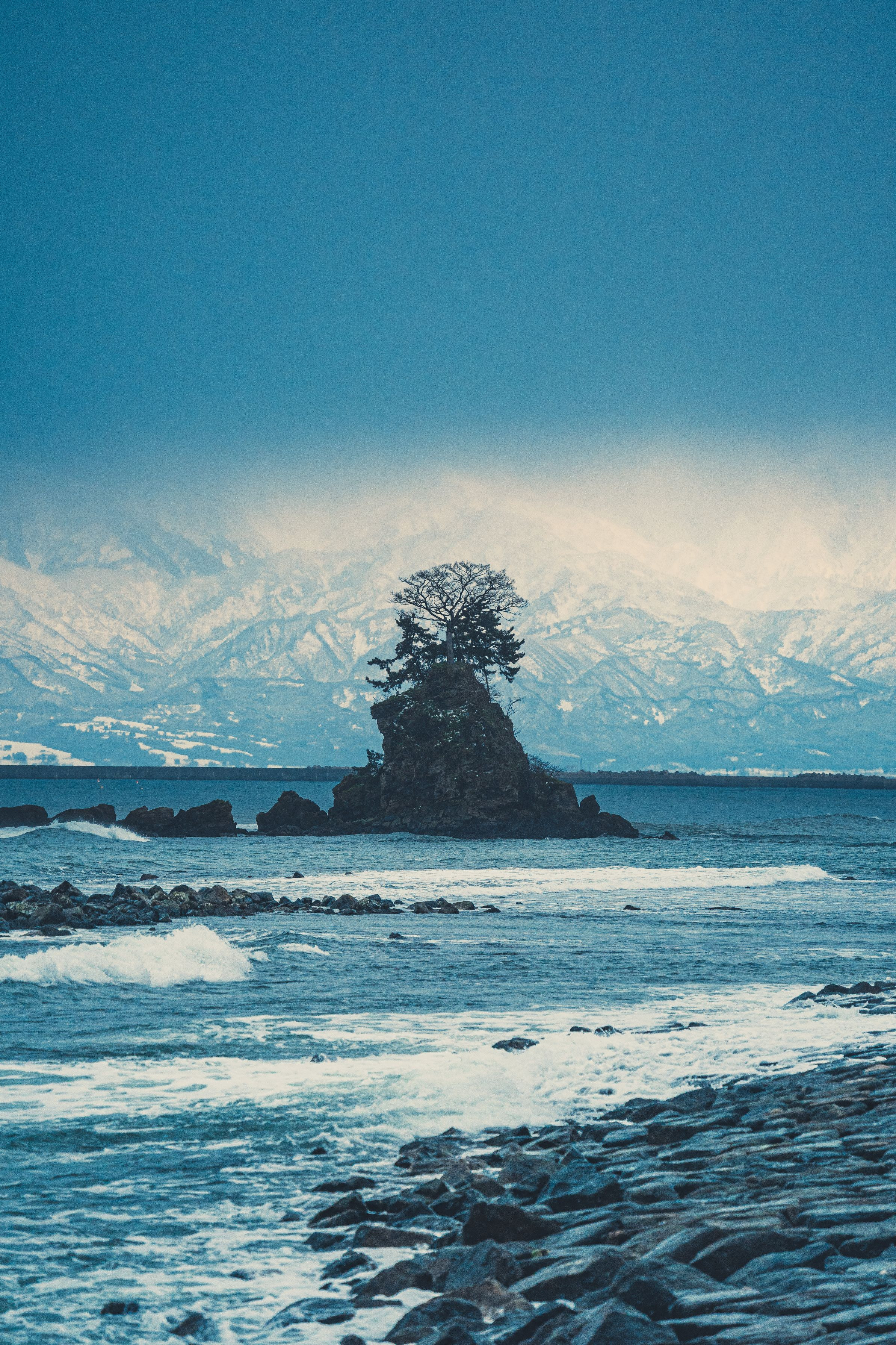 曇天の雨晴海岸です。 立山連峰が微妙に見えます。