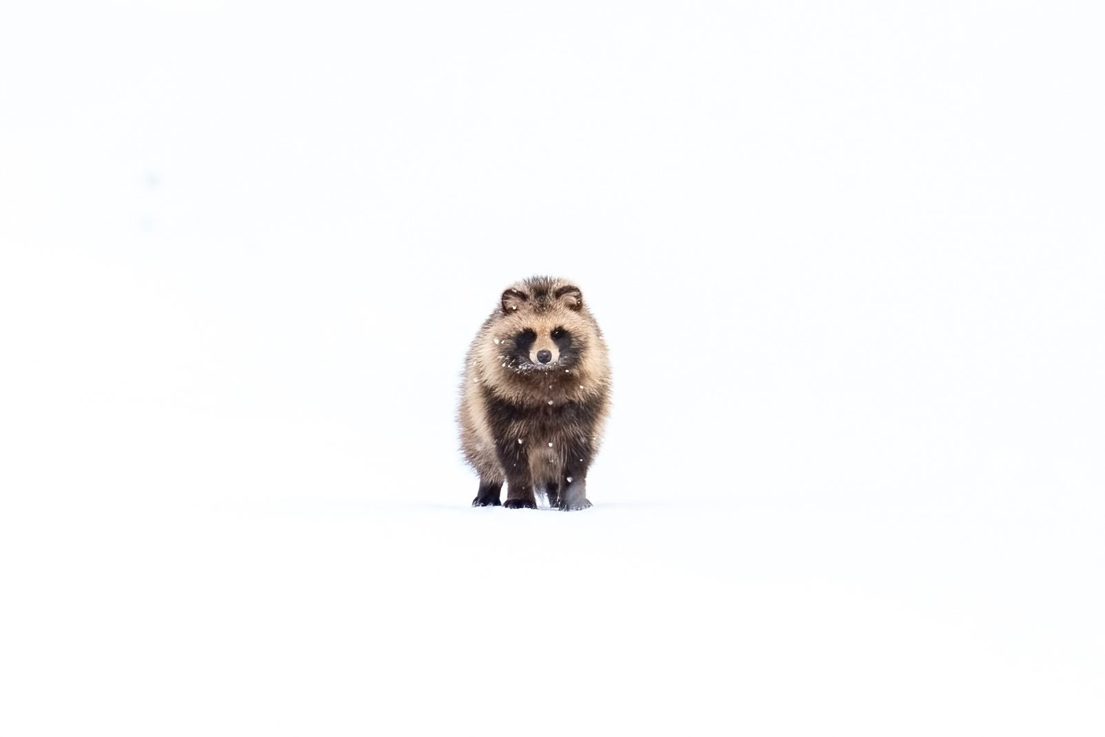 真っ白な中にエゾタヌキと遭遇しました。 一瞬お互い時が止まり、この後エゾタヌキはこちらに向かって走り出してきました。
